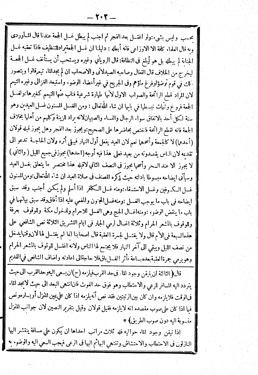 [قال الثالثة ان يتيقن وجود الماء في حد القرب فيلزمه (ح) ان يسعى إليه وحد القرب إلى حيث يتردد إليه المسافر للرعي والاحتطاب وهو فوق حد الغوث فان انتهى العبد إلى حيث لا يجد الماء في القوت فلا يلزمه وان كان بين الرتبتين فقد نص أنه يلزمه إذا كان علي يمين المنزل أو يساره ونص فيما إذا كان على صوب مقصده انه لا يلزمه فقيل قولان وقيل بتقرير النصين لان جوانب المنزل منسوبة إليه دون صوب الطريق] * إذا تيقن وجود الماء حواليه فله ثلاث مراتب احداها ان يكون علي مسافة ينتشر إليها