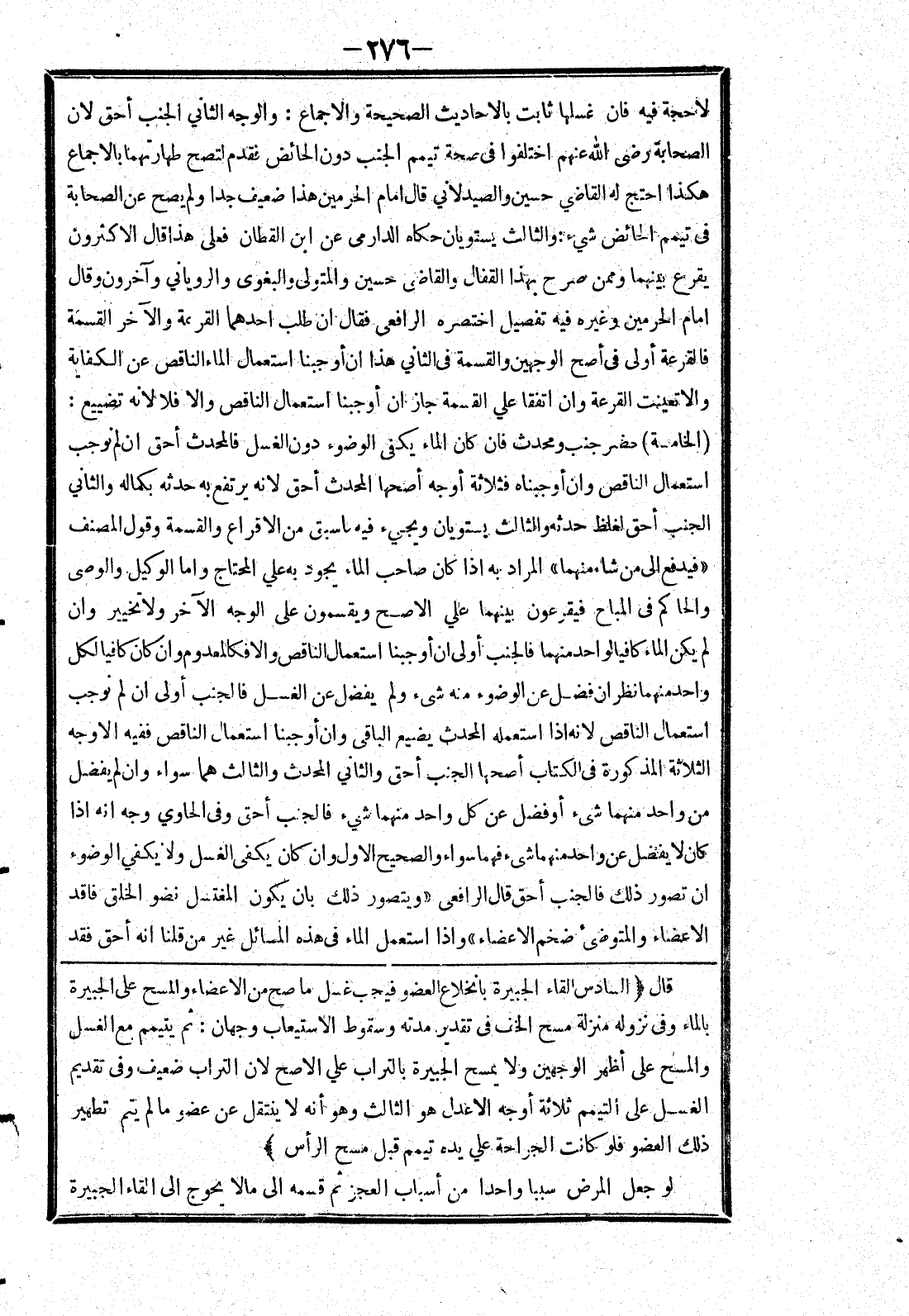 قال [السادس القاء الجبيرة بانخلاع العضو فيجب غسل ما صح من الاعضاء والمسح على الجبيرة بالماء وفى نزوله منزلة مسح الخف في تقدير مدته وسقوط الاستيعاب وجهان: ثم يتيمم مع الغسل والمسح على أظهر الوجهين ولا يمسح الجبيرة بالتراب علي الاصح لان التراب ضعيف وفى تقديم الغسل على التيمم ثلاثة أوجه الاعدل هو الثالث وهو أنه لا ينتقل عن عضو ما لم يتم تطهير ذلك العضو فلو كانت الجراحة علي يده تيمم قبل مسح الرأس] لو جعل المرض سببا واحدا من أسباب العجز ثم قسمه إلى مالا يحوج إلى القاء الجبيرة