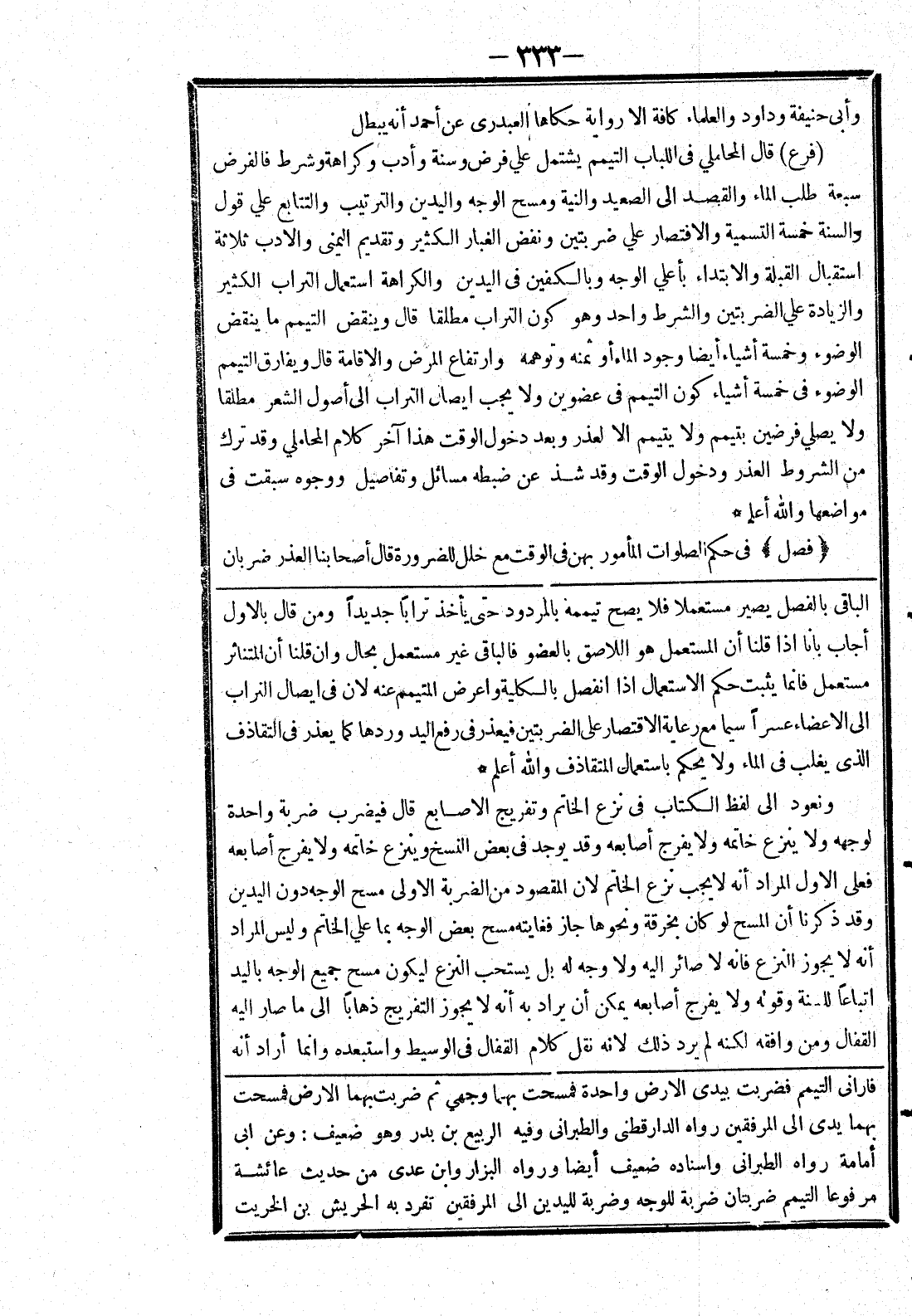 ونعود إلى لفظ الكتاب في نزع الخاتم وتفريج الاصابع قال فيضرب ضربة واحدة لوجهه ولا ينزع خاتمه ولا يفرج أصابعه وقد يوجد في بعض النسخ وينزع خاتمه ولا يفرج أصابعه فعلى الاول المراد أنه لا يجب نزع الخاتم لان المقصود من الضربة الاولى مسح الوجه دون اليدين وقد ذكرنا أن المسح لو كان بخرقة ونحوها جاز فغايته مسح بعض الوجه بما علي الخاتم وليس المراد أنه لا يجوز النزع فانه لا صائر إليه ولا وجه له بل يستحب النزع ليكون مسح جميع الوجه باليد اتباعا للسنة وقوله ولا يفرج أصابعه يمكن أن يراد به أنه لا يجوز التفريج ذهابا إلى ما صار إليه القفال ومن وافقه لكنه لم يرد ذلك لانه نقل كلام القفال في الوسيط واستبعده وانما أراد أنه]
