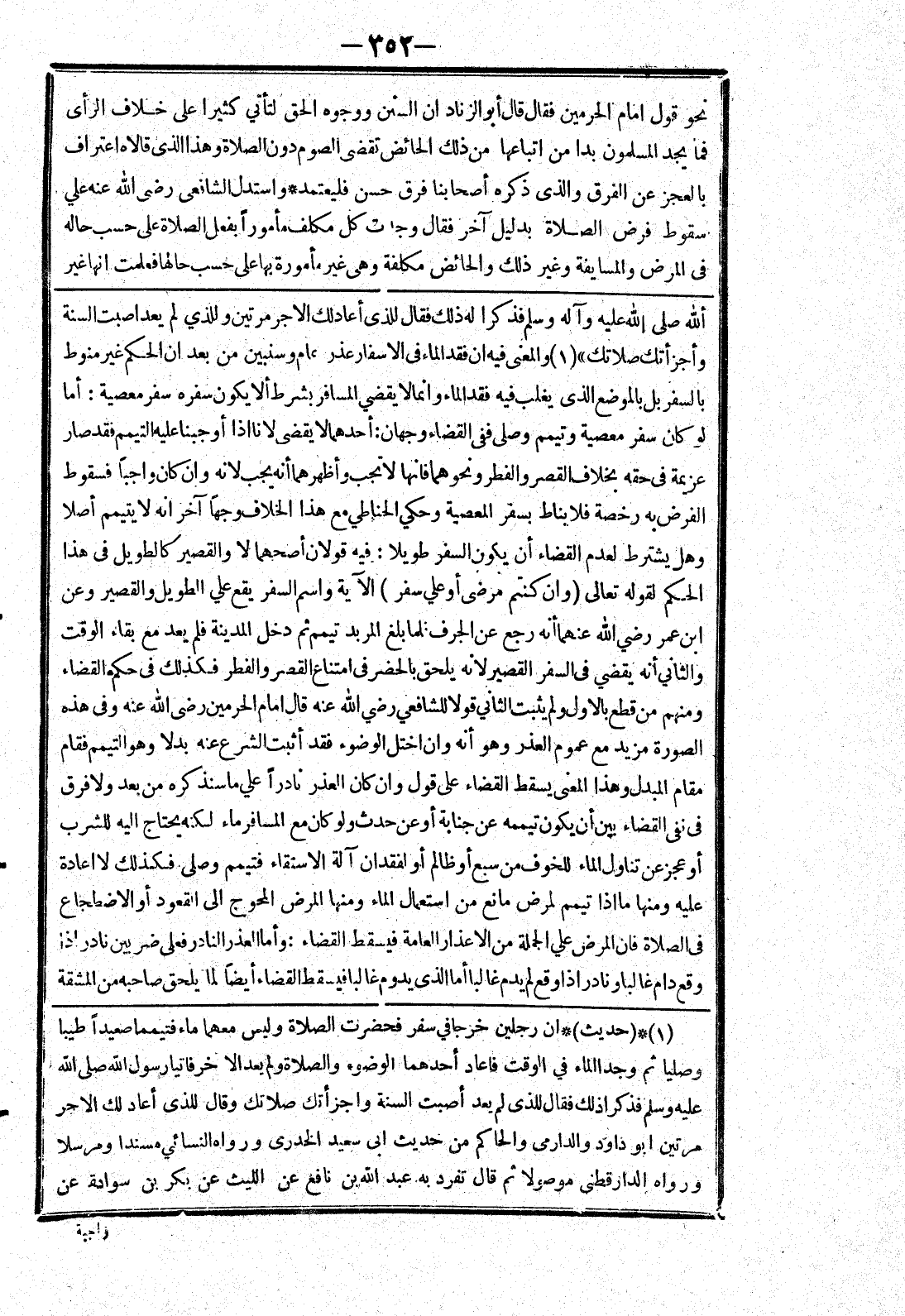 [ألله صلى الله عليه وسلم فذكرا له ذلك فقال للذى أعاد لك الاجر مرتين وللذي لم يعد اصبت السنة وأجزأتك صلاتك) والمعنى فيه ان فقد الماء في الاسفار عذر عام وسنبين من بعد ان الحكم غير منوط بالسفر بل بالموضع الذى يغلب فيه فقد الماء وانما لا يقضي المسافر بشرط ألا يكون سفره سفر معصية: أما