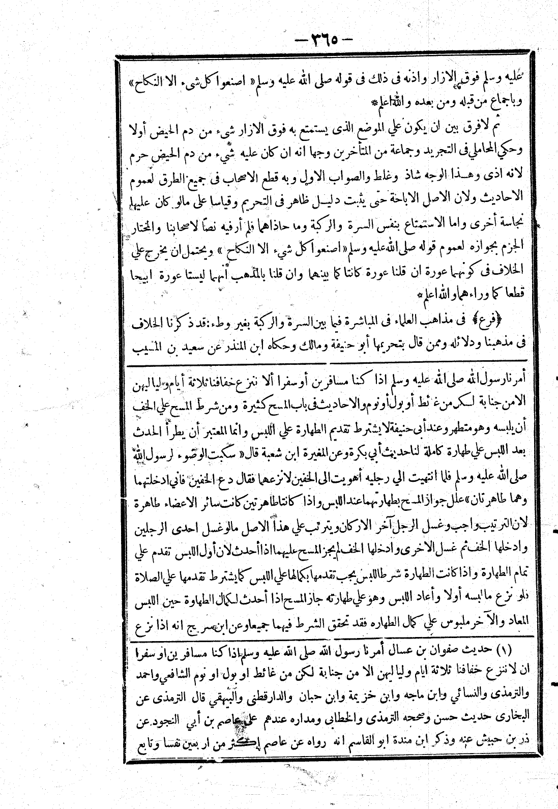 [أمرنا رسول الله صلى الله عليه وسلم إذا كنا مسافرين أو سفرا ألا ننزع خفافنا ثلاثة أيام ولياليهن الا من جنابة لكل من غائط أو بول أو نوم والاحاديث في باب المسح كثيرة ومن شرط المسح علي الخف أن يلبسه وهو متطهر وعند أبى حنيفة لا يشترط تقديم الطهارة علي اللبس وانما المعتبر أن يطرأ الحدث بعد اللبس علي طهارة كاملة لنا حديث أبي بكرة وعن المغيرة ابن شعبة قال (سكبت الوضوء لرسول الله صلى الله عليه وسلم فلما انتهيت الي رجليه أهويت إلى الخفين لانزعهما فقال دع الخفين فاني ادخلتهما وهما طاهرتان) علل جواز المسح بطهارتهما عند اللبس وإذا كانتا طاهرتين كانت سائر الاعضاء طاهرة لان الترتيب واجب وغسل الرجل آخر الاركان ويترتب علي هذا الاصل مالو غسل احدى الرجلين وادخلها الخف ثم غسل الاخرى وادخلها الخف لم يجز المسح عليهما إذا أحدث لان أول اللبس تقدم علي تمام الطهارة وإذا كانت الطهارة شرطا للبس يجب تقدمها بكمالها علي اللبس كما يشترط تقدمها علي الصلاة فلو نزع ما لبسه أولا وأعاد اللبس وهو علي طهارته جاز المسح إذا أحدث لكمال الطهارة حين اللبس المعاد والآخر ملبوس علي كمال الطهارة فقد تحقق الشرط فيهما جميعا وعن ابن سريج انه إذا نزع]
