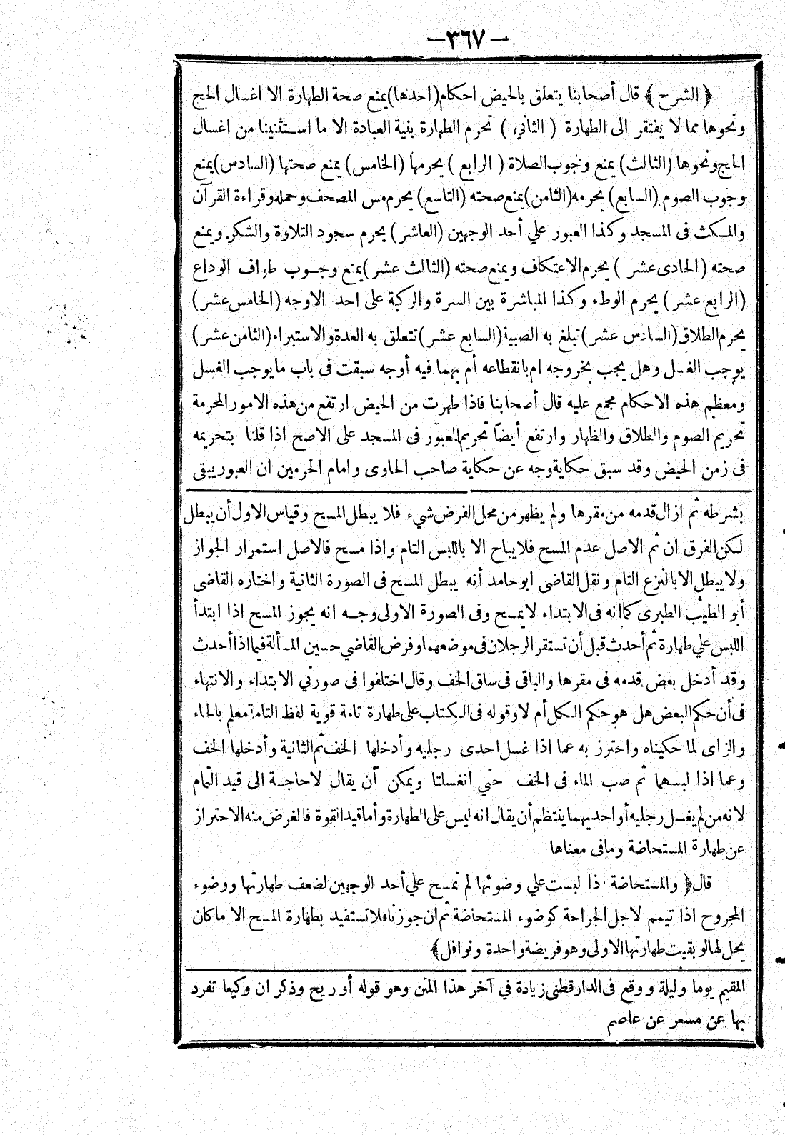 [بشرطه ثم ازال قدمه من مقرها ولم يظهر من محل الفرض شئ فلا يبطل المسح وقياس الاول أن يبطل لكن الفرق ان ثم الاصل عدم المسح فلا يباح الا باللبس التام وإذا مسح فالاصل استمرار الجواز ولا يبطل الا بالنزع التام ونقل القاضى أبو حامد أنه يبطل المسح في الصورة الثانية واختاره القاضى أبو الطيب الطبري كما انه في الابتداء لا يمسح وفى الصورة الاولى وجه انه يجوز المسح إذا ابتدأ اللبس علي طهارة ثم أحدث قبل أن تستقر الرجلان في موضعهما وفرض القاضي حسين المسألة فيما إذا أحدث وقد أدخل بعض قدمه في مقرها والباقى في ساق الخف وقال اختلفوا في صورتي الابتداء والانتهاء في أن حكم البعض هل هو حكم الكل أم لا وقوله في الكتاب على طهارة تامة قوية لفظ التامة معلم بالحاء والزاى لما حكيناه واحترز به عما إذا غسل احدى رجليه وأدخلها الخف ثم الثانية وأدخلها الخف وعما إذا لبسهما ثم صب الماء في الخف حتي انغسلتا ويمكن أن يقال لا حاجة إلى قيد التمام لانه من لم يغسل رجليه أو احديهما ينتظم أن يقال انه ليس على الطهارة وأما قيد القوة فالغرض منه الاحتراز عن طهارة المستحاضة وما في معناها قال [والمستحاضة إذا لبست علي وضوئها لم تمسح علي أحد الوجهين لضعف طهارتها ووضوء المجروح إذا تيمم لاجل الجراحة كوضوء المستحاضة ثم ان جوزنا فلا تستفيد بطهارة المسح الا ما كان يحل لها لو بقيت طهارتها الاولى وهو فريضة واحدة ونوافل]