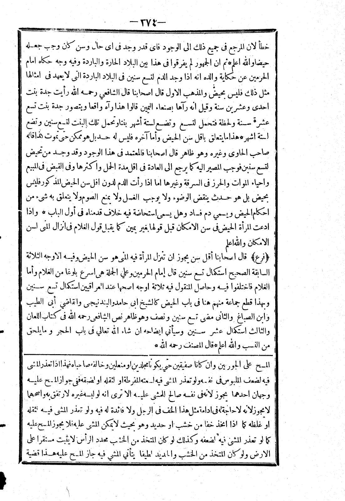 [المسح على الجوربين وان كانا صفيقين حتي يكونا مجلدين أو منعلين وخالفه صاحباه فهذا إذا تعذر المشى فيه لضعف الملبوس في نفسه ولو تعذر المشى فيه لسعته المفرطة أو لثقله أو لضبقه ففى جواز المسح عليه وجهان احدهما يجوز لانه في نفسه صالح للمشى عليه الا ترى انه لو لبسه غيره لارتفق به واصحهما لا يجوز لانه لا حاجة له في ادامة مثل هذا الخف في الرجل ولا فائدة له فيه ولو تعذر المشى فيه لثقله أو غلظه كما إذا اتخذ خفا من خشب أو حديد وهو بحيث لا يمكن المشى عليه فلا يجوز المسح عليه كما لو تعذر المشئ فيه لضعفه وكذلك لو كان المتخذ من الخشب محدد الرأسي لا يثبت مسنقرا على
