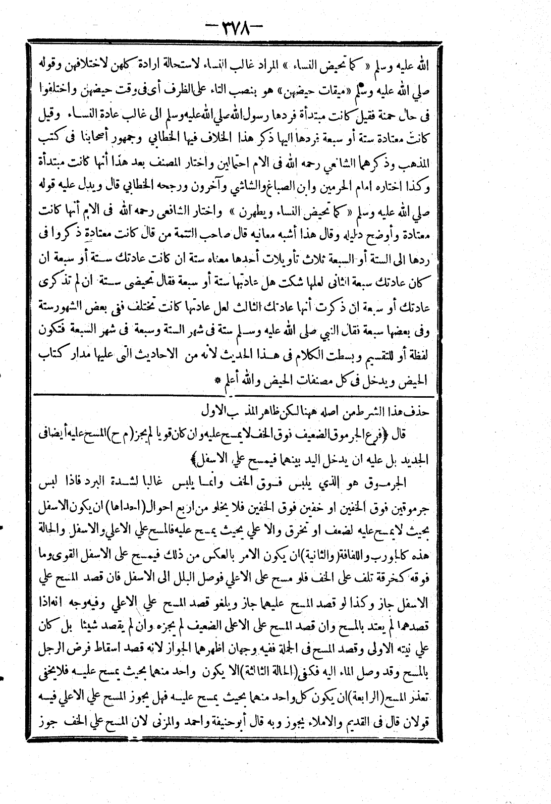 بالمسح وقد وصل الماء إليه فكفى (الحالة الثالثة) الا يكون واحد منهما بحيث يمسح عليه فلا يخفى تعذر المسح (الرابعة) ان يكون كل واحد منهما بحيث يمسح عليه فهل يجوز المسح علي الاعلي فيه قولان قال في القديم والاملاء يجوز وبه قال أبو حنيفة واحمد والمزنى لان المسح علي الخف جوز]