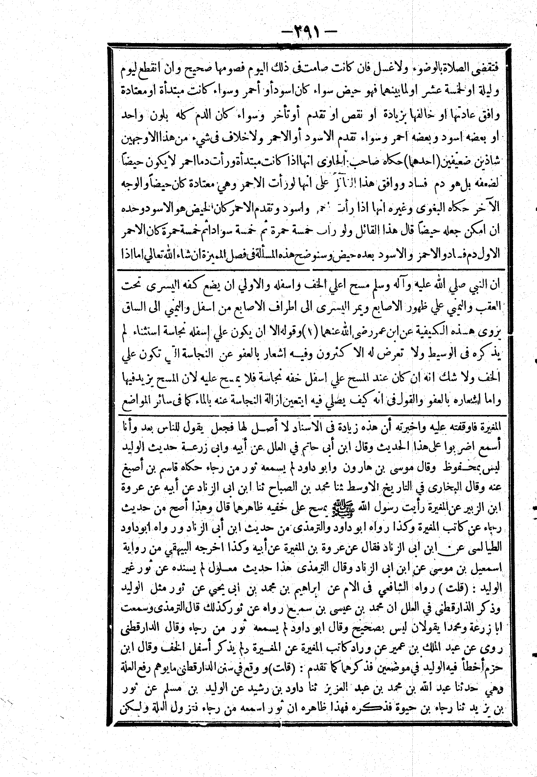 [ان النبي صلى الله عليه وسلم مسح اعلي الخف واسفله والاولي ان يضع كفه اليسرى تحت العقب واليمني علي ظهور الاصابع ويمر اليسرى إلى اطراف الاصابع من اسفل واليمني إلى الساق يروى هذه الكيفية عن ابن عمر رضى الله عنهما وقوله الا ان يكون علي اسفله نجاسة استثناء لم يذكره في الوسيط ولا تعرض له الاكثرون وفيه اشعار بالعفو عن النجاسة التي تكون علي الخف ولا شك انه ان كان عند المسح علي اسفل خفه نجاسة فلا يمسح عليه لان المسح يزيد فيها واما اشعاره بالعفو والقول في انه كيف يصلي فيه ايتعين ازالة النجاسة عنه بالماء كما في سائر المواضع]
