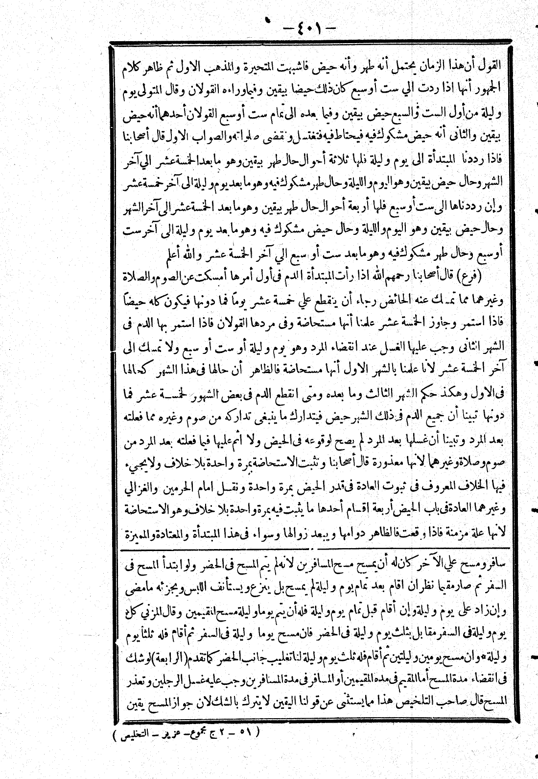 [سافر ومسح علي الآخر كان له أن يمسح مسح المسافرين لانه لم يتم المسح في الحضر ولو ابتدأ المسح في السفر ثم صار مقيما نظر ان اقام بعد تمام يوم وليلة لم يمسح بل ينزع ويستأنف اللبس ويجزئه ما مضى وإن زاد على يوم وليلة وإن أقام قبل تمام يوم وليلة فله أن يتم يوما وليلة مسح المقيمين وقال المزني كل يوم وليلة في السفر مقابل بثلث يوم وليلة في الحضر فان مسح يوما وليلة في السفر ثم أقام فله ثلثا يوم وليلة * وان مسح يومين وليلتين ثم أقام فله ثلث يوم وليلة لنا تغليب جانب الحضر كما تقدم (الرابعة) لو شك في انقضاء مدة المسح أما المقيم في مده المقيمين أو المسافر في مدة المسافرين وجب عليه غسل الرجلين وتعذر المسح قال صاحب التلخيص هذا مما يستثنى عن قولنا اليقين لا يترك بالشك لان جواز المسح يقين]