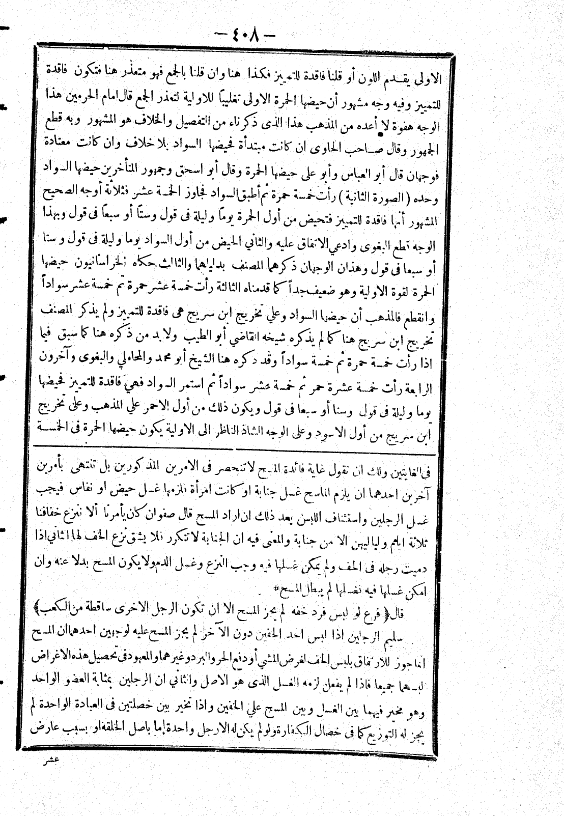 [في الغايتين ولك ان تقول غاية فائدة المسح لا تنحصر في الامرين المذكورين بل تنتهى بأمرين آخرين احدهما ان يلزم الماسح غسل جنابة أو كانت امرأة فلزمها غسل حيض أو نفاس فيجب غسل الرجلين واستئناف اللبس بعد ذلك ان اراد المسح قال صفوان كان يأمرنا ألا ننزع خفافنا ثلاثا ايام ولياليهن الا من جنابة والمعنى فيه ان الجنابة لا تتكرر فلا يشق نزع الخف لها الثاني إذا