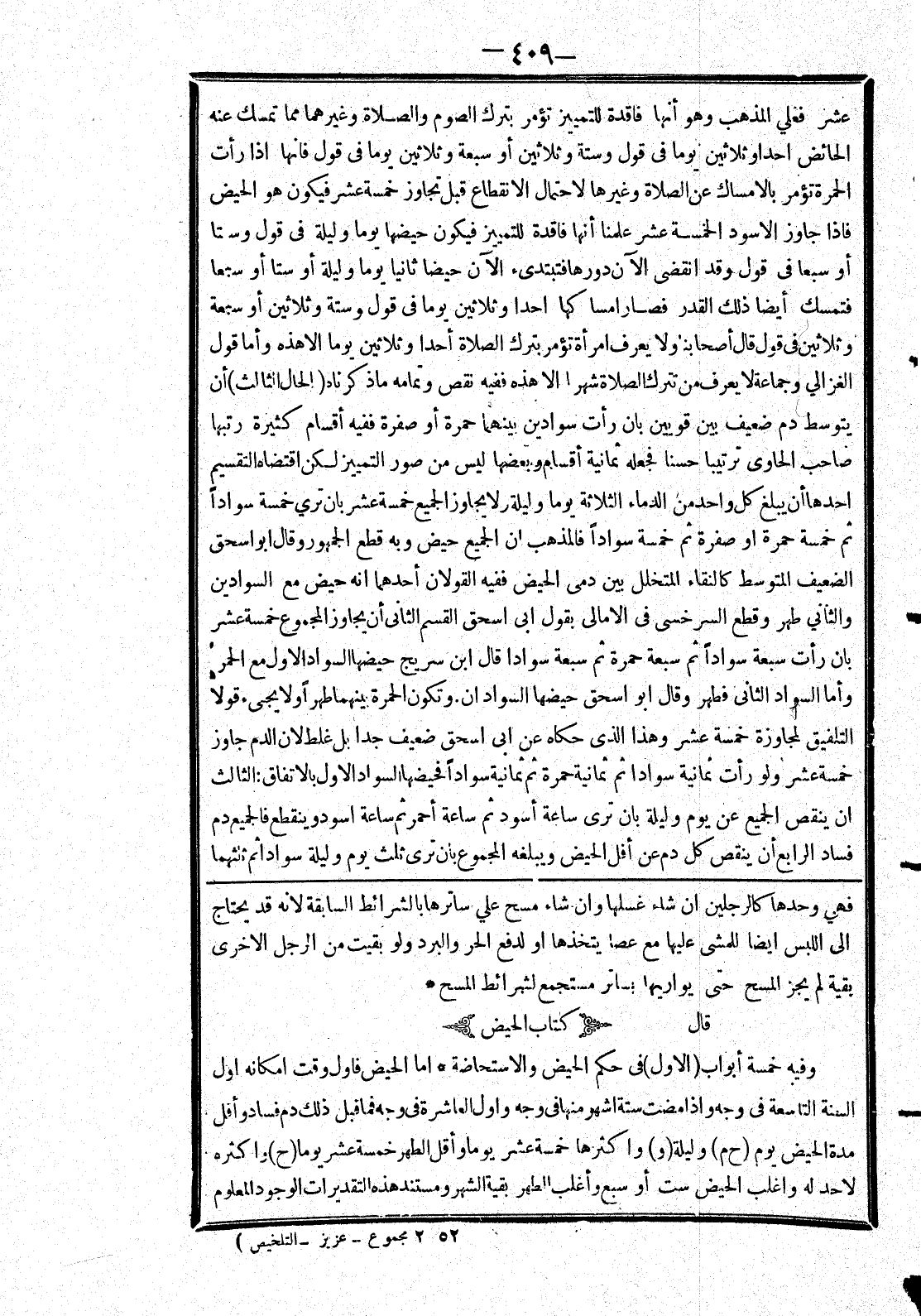 [فهي وحدها كالرجلين ان شاء غسلها وان شاء مسح علي ساترها بالشرائط السابقة لانه قد يحتاج إلى اللبس ايضا للمشى عليها مع عصا يتخذها أو لدفع الحر والبرد ولو بقيت من الرجل الاخرى بقية لم يجز المسح حتى يواريها بساتر مستجمع لشرائط المسح * قال * (كتاب الحيض) * وفيه خمسة أبواب (الاول) في حكم الحيض والاستحاضة * اما الحيض فاول وقت امكانه اول السنة التاسعة في وجه وإذا مضت ستة اشهر منها في وجه واول العاشرة في وجه فما قبل ذلك دم فساد وأقل مدة الحيض يوم (ح م) وليلة (و) واكثرها خمسة عشر يوما وأقل الطهر خمسة عشر يوما (ح) واكثره لاحد له واغلب الحيض ست أو سبع وأغلب الطهر بقية الشهر ومستند هذه التقديرات الوجود المعلوم]