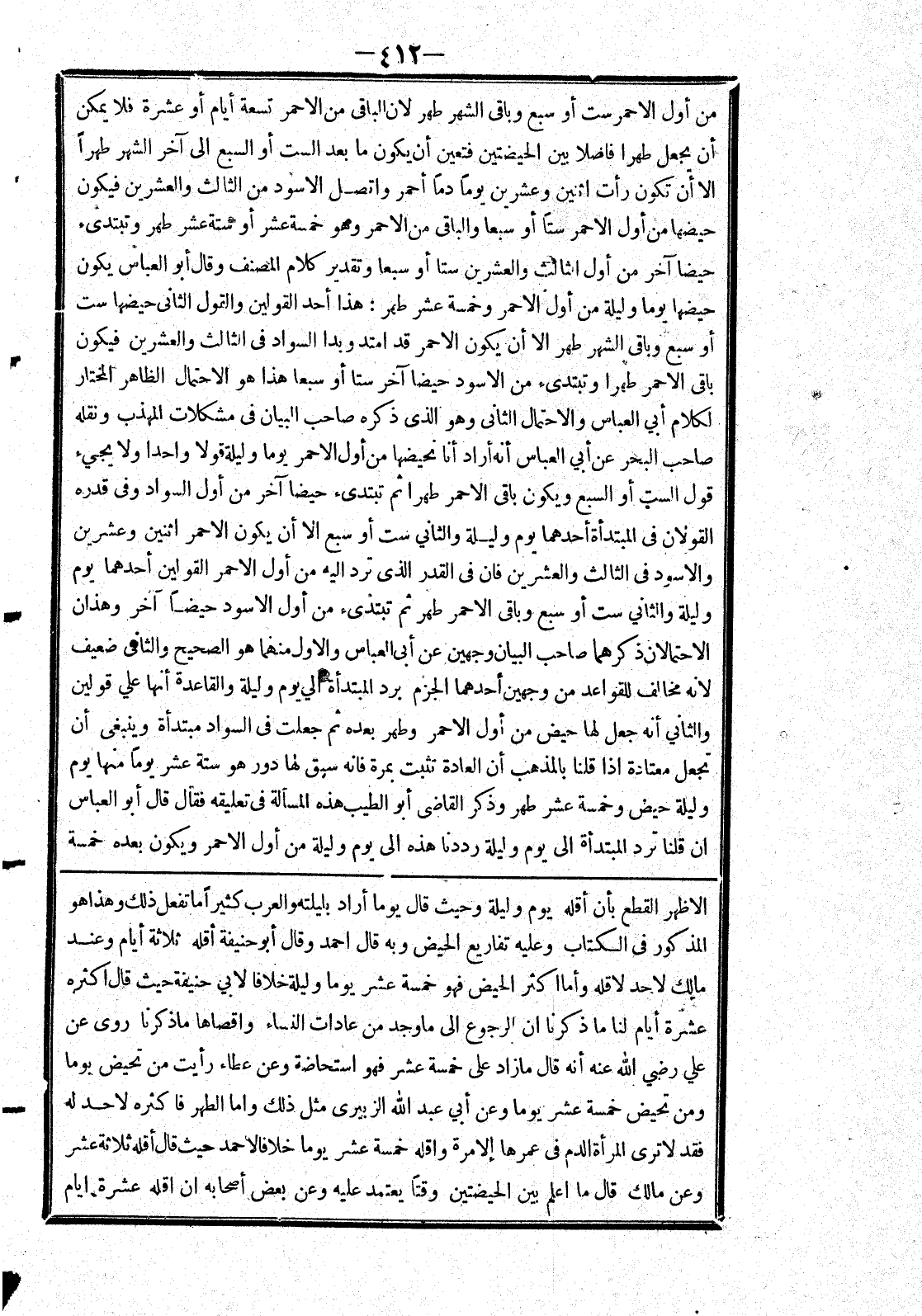 [الاظهر القطع بأن أقله يوم وليلة وحيث قال يوما أراد بليلته والعرب كثيرا ما تفعل ذلك وهذا هو المذكور في الكتاب وعليه تفاريع الحيض وبه قال احمد وقال أبو حنيفة أقله ثلاثة أيام وعند مالك لاحد لاقلة وأما اكثر الحيض فهو خمسة عشر يوما وليلة خلافا لابي حنيفة حيث قال اكثره عشرة أيام لنا ما ذكرنا ان الرجوع إلى ما وجد من عادات النساء واقصاها ما ذكرنا روى عن علي رضي الله عنه أنه قال ما زاد على خمسة عشر فهو استحاضة وعن عطاء رأيت من تحيض يوما ومن تحيض خمسة عشر يوما وعن أبي عبد الله الزبيري مثل ذلك واما الطهر فأكثره لا حد له فقد لا ترى المرأة الدم في عمرها إلا مرة واقله خمسة عشر يوما خلافا لاحمد حيث قال أقله ثلاثة عشر وعن مالك قال ما اعلم بين الحيضتين وقتا يعتمد عليه وعن بعض أصحابه ان اقله عشرة ايام]