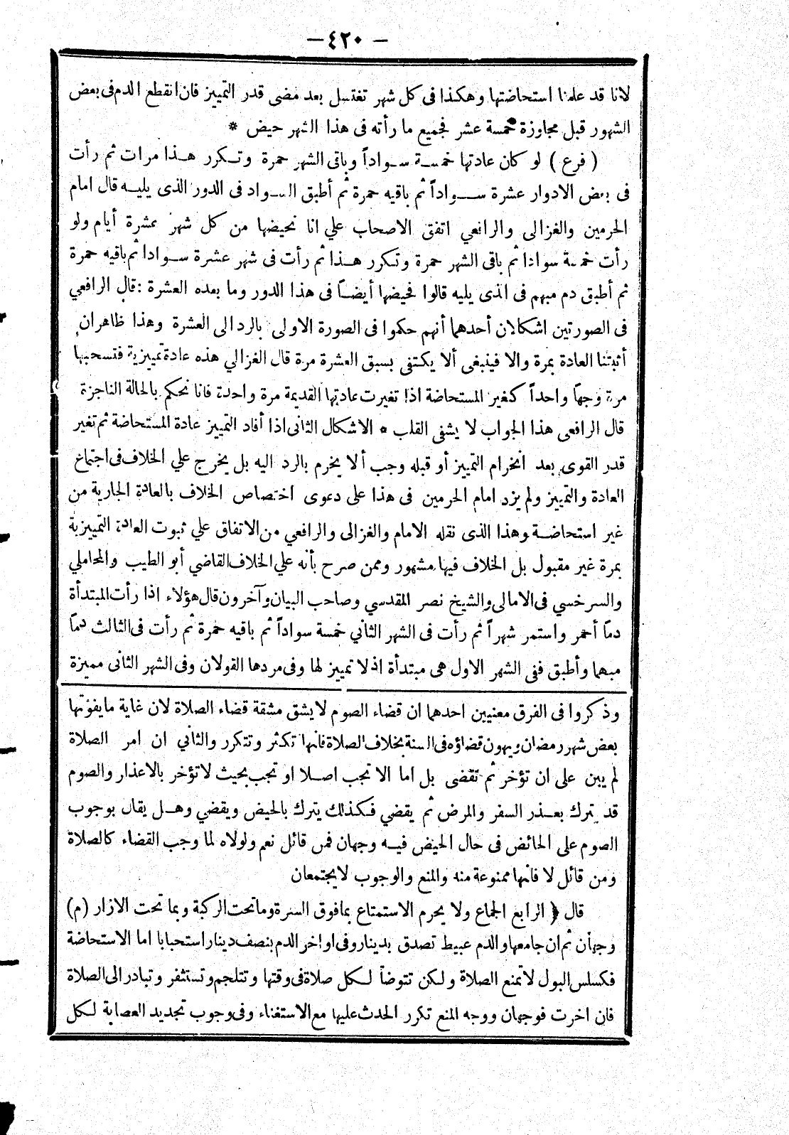 الصوم على الحائض في حال الحيض فيه وجهان فمن قائل نعم ولولاه لما وجب القضاء كالصلاة ومن قائل لا فانها ممنوعة منه والمنع والوجوب لا يجتمعان قال [الرابع الجماع ولا يحرم الاستمتاع بما فوق السرة وما تحت الركبة وبما تحت الازار (م) وجهان ثم ان جامعها والدم عبيط تصدق بدينار وفى اواخر الدم بنصف دينار استحبابا اما الاستحاضة فكسلس البول لا تمنع الصلاة ولكن تتوضأ لكل صلاة في وقتها وتتلجم وتستثفر وتبادر إلى الصلاة فان اخرت فوجهان ووجه المنع تكرر الحدث عليها مع الاستغناء وفى وجوب تجديد العصابة لكل]
