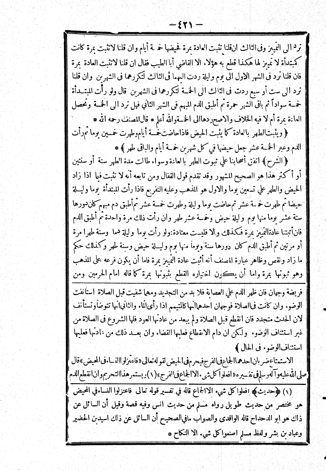 [فريضة وجهان فان ظهر الدم علي العصابة فلا بد من التجديد ومهما شفيت قبل الصلاة استانفت الوضوء وان كانت في الصلاة فوجهان احدهما انها كالتيمم إذا رأى الماء والثاني انها تتوضأ وتستأنف لان الحدث متجدد فان انقطع قبل الصلاة ولم يبعد من عادتها العود فلها الشروع في الصلاة من غير استئناف الوضوء ولكن ان دام الانقطاع فعليها القضاء وان بعد ذلك من عادتها فعليها استئناف الوضوء في الحال] الاستمتاع ضربان احدهما الجماع في الفرج فيحرم في الحيض لقوله تعالى (فاعتزلوا النساء في المحيض) قال صلى الله عليه وسلم في تفسيره (افعلوا كل شئ الا الجماع في الفرج) ويستمر هذا التحريم وان انقطع الدم]