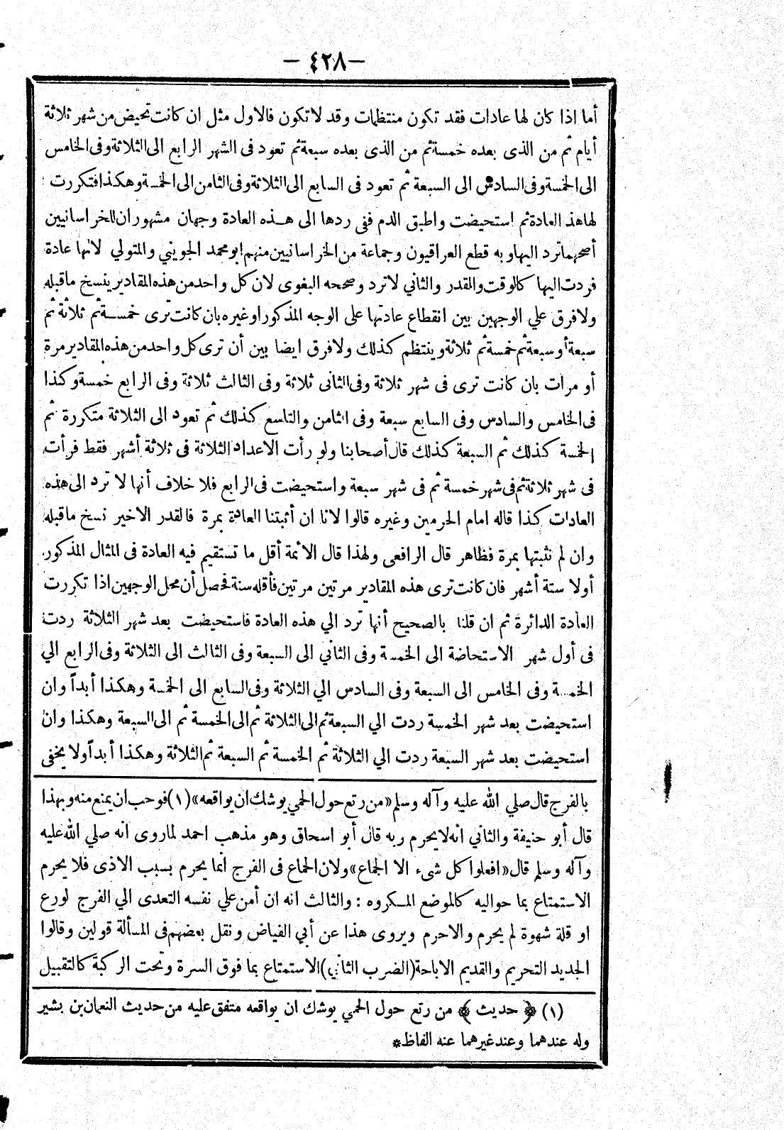 [بالفرج قال صلي الله عليه وسلم وسلم (من رتع حول الحمي يوشك ان يواقعه) فوجب ان يمنع منه وبهذا قال أبو حنيفة والثاني انه لا يحرم وبه قال أبو إسحاق وهو مذهب احمد لما روى انه صلي الله عليه وسلم قال (افعلوا كل شئ الا الجماع) ولان الحماع في الفرج انما يحرم بسبب الاذى فلا يحرم الاستمتاع بما حواليه كالموضع المكروه: والثالث انه ان أمن علي نفسه التعدي الي الفرج لورع أو قلة شهوة لم يحرم والاحرم ويروى هذا عن أبي الفياض ونقل بعضهم في المسألة قولين وقالوا الجديد التحريم والقديم الاباحة (الضرب الثاني) الاستمتاع بما فوق السرة وتحت الركبة كالتقبيل]