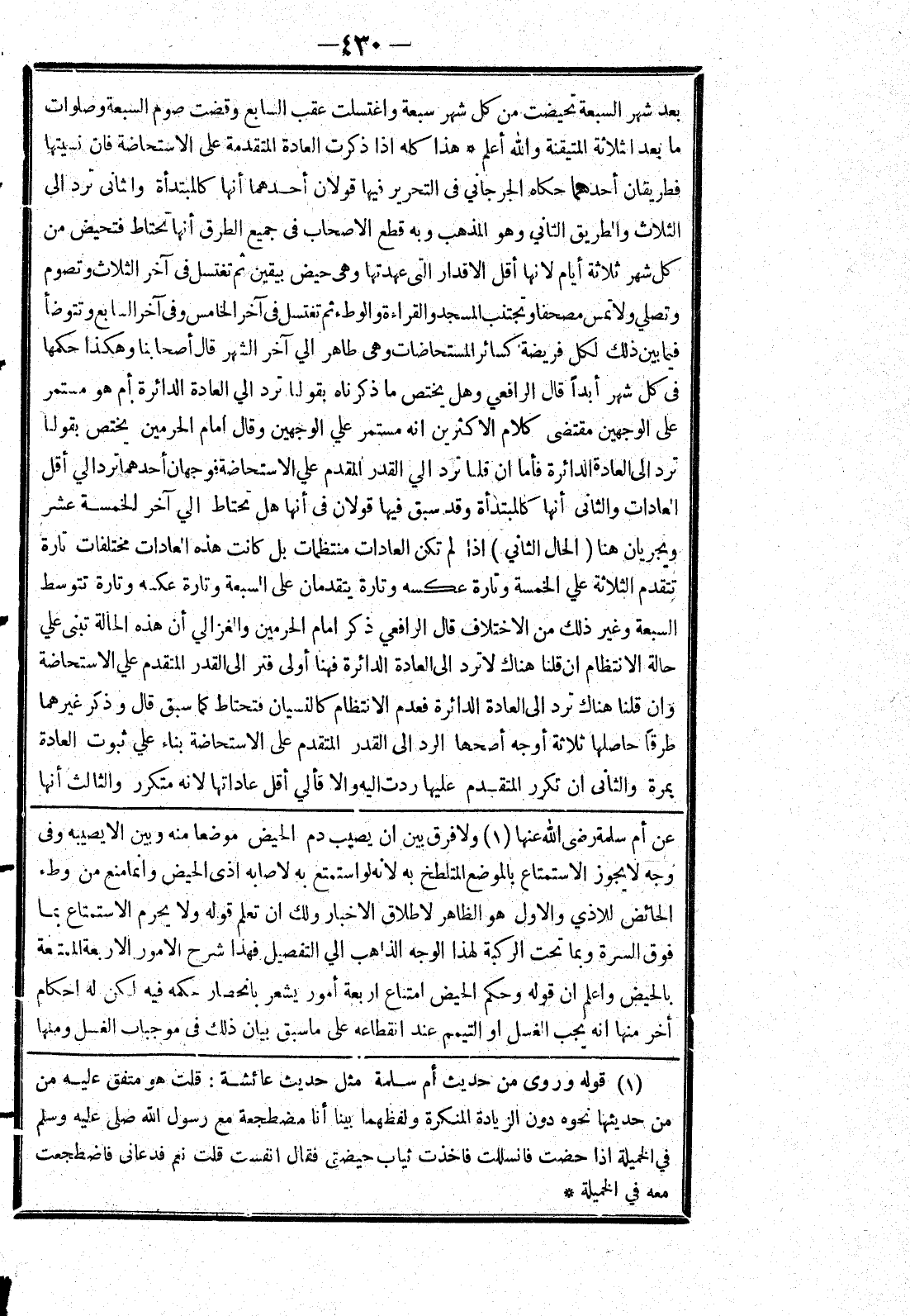 [عن أم سلمة رضى الله عنها ولا فرق بين ان يصيب دم الحيض موضعا منه وبين الا يصيبه وفى وجه لا يجوز الاستمتاع بالموضع المتلطخ به لانه لو استمتع به لاصابه اذى الحيض وانما منع من وطئ الحائض للاذي والاول هو الظاهر لاطلاق الاخبار ولك ان تعلم قوله ولا يحرم الاستمتاع بما فوق السرة وبما تحت الركبة لهذا الوجه الذاهب الي التفصيل فهذا شرح الامور الاربعة الممنعة بالحيض واعلم ان قوله وحكم الحيض امتناع اربعة أمور يشعر بانحصار حكمه فيه لكن له احكام