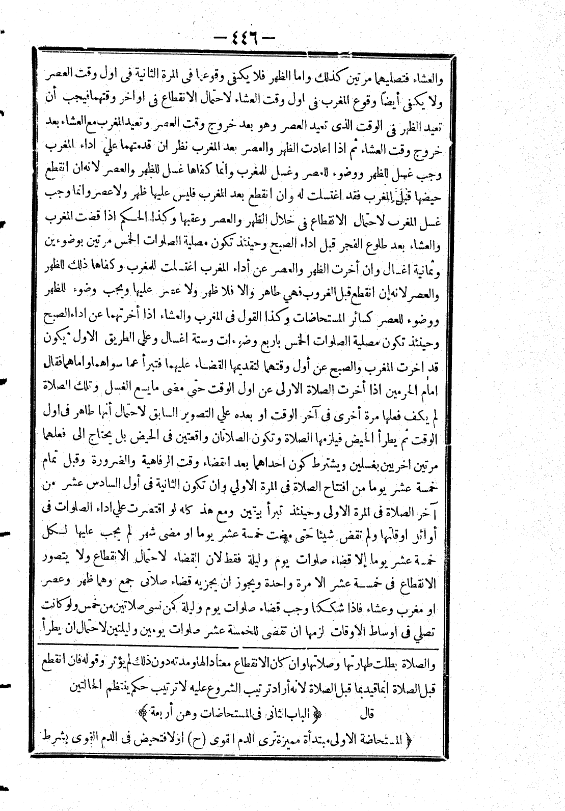 [والصلاة بطلت طهارتها وصلاتها وان كان الانقطاع معتادا لها ومدته دون ذلك لم يؤثر وقوله فان انقطع قبل الصلاة انما قيد بما قبل الصلاة لانه أراد ترتيب الشروع عليه لا ترتيب حكم ينتظم الحالتين قال * (الباب الثاني في المستحاضات وهن أربعة) * [المستحاضة الاولى مبتدأة مميزة ترى الدم اقوى (ح) اولا فتحيض في الدم القوى بشرط]