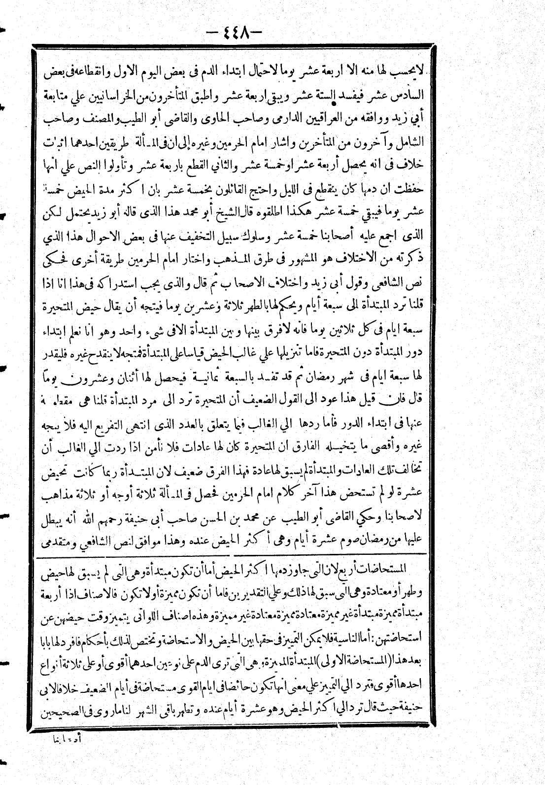 [المستحاضات أربع لان التى جاوز دمها اكثر الحيض أما أن تكون مبتدأة وهى التى لم يسبق لها حيض وطهر أو معتادة وهى التى سبق لها ذلك وعلي التقديرين فاما أن تكون مميزة أو لا تكون فالاصناف إذا أربعة مبتدأة مميزة مبتدأة غير مميزة معتادة مميزة معتادة غير مميزة وهذا اصناف اللواتى يتميز وقت حيضهن عن استحاضتهن: أما الناسية فلا يمكن التمييز في حقها بين الحيض والاستحاضة وتختص لذلك بأحكام فافرد لها بابا بعد هذا (المستحاضة الاولى) المبتدأة المميزة وهى التى ترى الدم على نوعين احدهما أقوى أو على ثلاثة أنواع احدها أقوى فترد الي التمييز علي معنى انها تكون حائضا في ايام القوى مستحاضة في أيام الضعيف خلافا لابي حنيفة حيث قال ترد إلى اكثر الحيض وهو عشرة أيام عنده وتطهر باقى الشهر لنا ماروى في الصحيحين]
