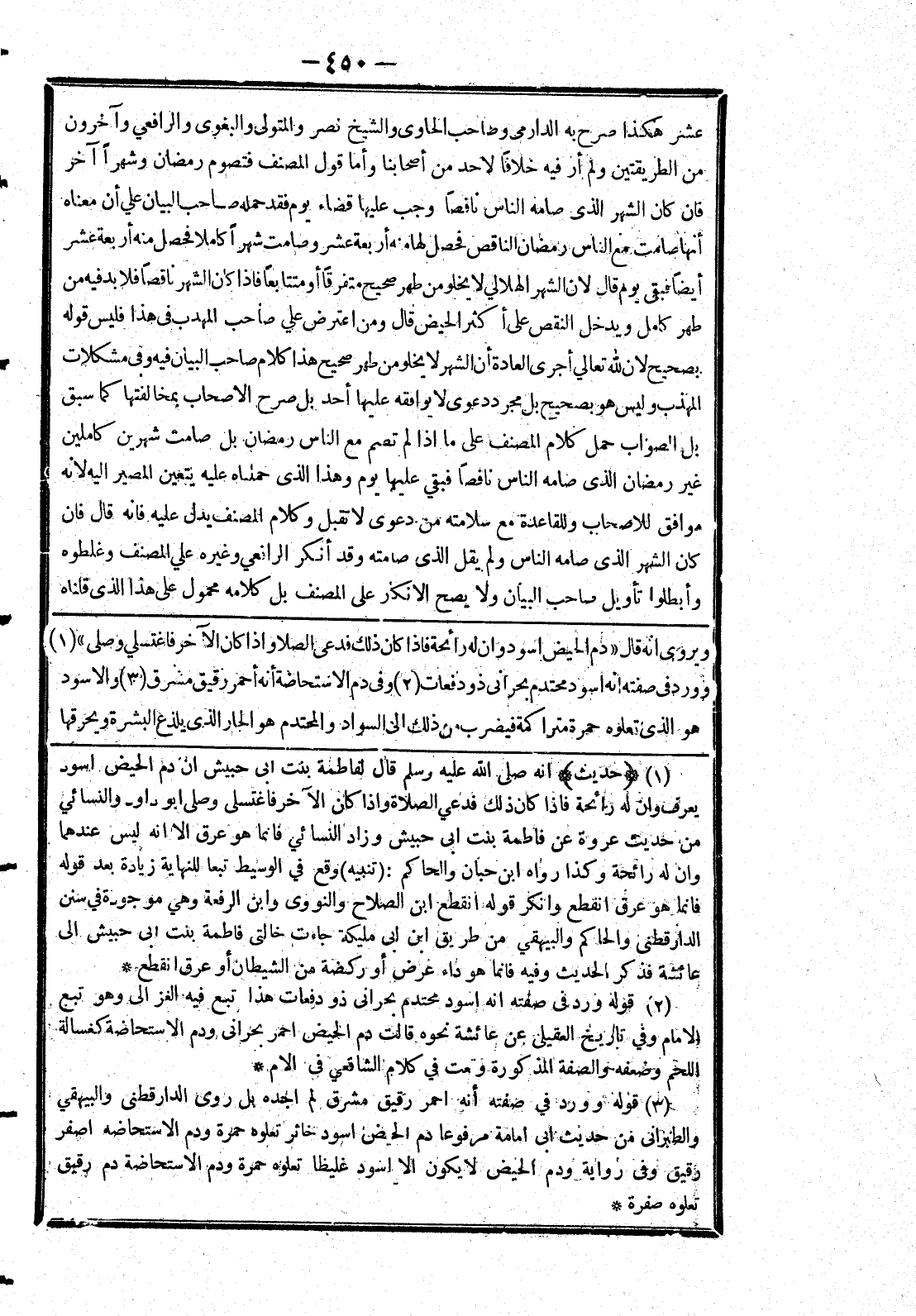 [ويروى انه قال (دم الحيض اسود وان له رائحة فإذا كان ذلك فدعى الصلا وإذا كان الآخر فاغتسلي وصلى) وورد في صفته انه اسود محتدم بحراني ذو دفعات وفى دم الاستحاضة أنه أحمر رقيق مشرق والاسود هو الذى تعلوه حمرة متراكمة فيضرب من ذلك إلى السواد والمحتدم هو الجار الذى يلذع البشرة ويحرقها]