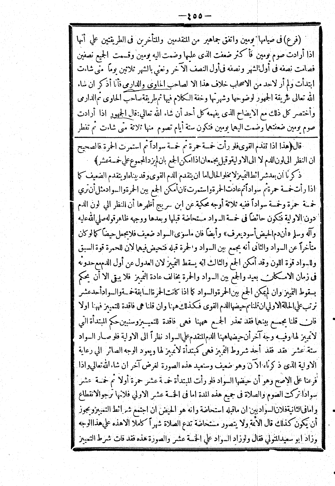 [قال [هذا إذا تقدم القوى فلو رأت خمسة حمرة ثم خمسة سوادا ثم استمرت الحمرة فالصحيح ان النظر إلى لون الدم لا إلى الاولية وقيل يجمعان إذا امكن الجمع بان لم يزد المجموع علي خمسة عشر] ذكرنا ان بعد شرائط التمييز لا يخلو الحال اما ان يتقدم الدم القوى وقد بيناه أو يتقدم الضعيف كما إذا رأت خمسة حمرة ثم سوادا ثم عادت الحمرة واستمرت فان أمكن الجمع بين الحمرة والسواد مثل أن تري خمسة حمرة وخمسة سوادا ففيه ثلاثة أوجه محكية عن ابن سريج أظهرها أن النظر الي لون الدم دون الاولية فتكون حائضا في خمسة السواد مستحاضة قبلها وبعدها ووجه ظاهر قوله صلي الله عليه