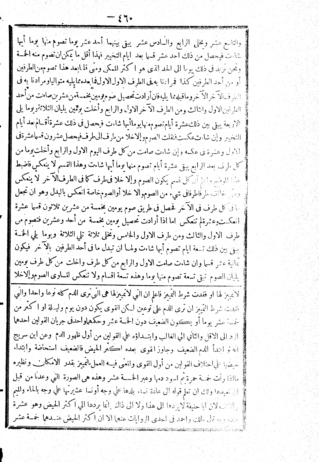 [لا تمييز لها أو فقدت شرط التمييز فاعلم ان التي لا تمييز لها هي التى ترى الدم كله نوعا واحدا والتي فقدت شرط التمييز ان ترى الدم على نوعين لكن القوى يكون دون يوم وليلة أو اكثر من خمسة عشر يوما أو يكون الضعيف دون الخمسة عشر وحكمهما واحد في جريان القولين احدهما الرد إلى الاقل والثاني الي الغالب وابتداؤه علي القولين من أول ظهور الدم وعن ابن سريج انه لو ابتدأ الدم الضعيف وجاوز القوى بعده اكثر الحيض فالضعيف استحاضة وابتداء حيضها علي اختلاف القولين من أول القوى والمعنى فيه العمل بالتمييز بقدر الامكان ونظيره ما إذا رأت خمسة حمرة ثم اسود دمها وعبر الخمسة عشر وهذه هي الصورة التي وعدنا من قبل ان نعيدها ولك ان تعلم قوله إلى عادة نساء بلدها علي وجه أو نساء عشيرتها علي وجه بالحاء والميم والالف لان ابا حنيفة لا يردها إلى هذا ولا إلى ذاك انما يردها الي اكثر الحيض وهو عشرة عنده وبه قال مالك واحمد في احدى الروايات عنهما الا ان اكثر الحيض عندهما خمسة عشر]