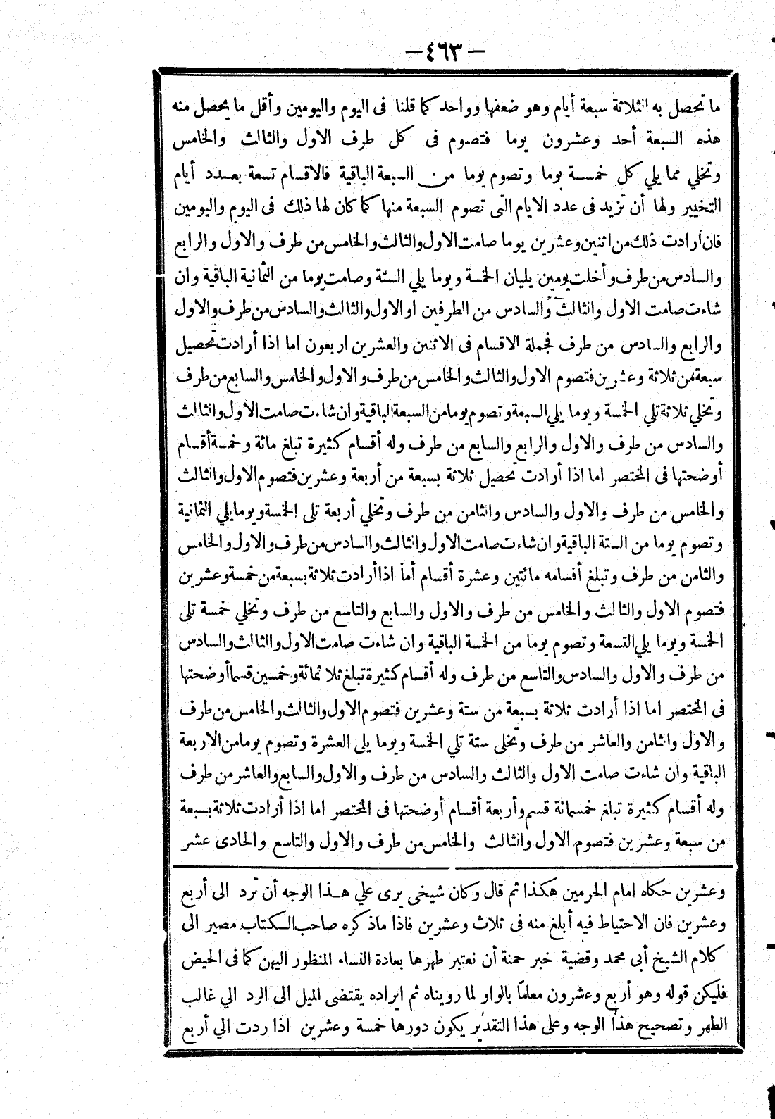 [وعشرين حكاه امام الحرمين هكذا ثم قال وكان شيخي يرى علي هذا الوجه أن ترد إلى أربع وعشرين فان الاحتياط فيه أبلغ منه في ثلاث وعشرين فإذا ما ذكره صاحب الكتاب مصير إلى كلام الشيخ أبى محمد وقضية خبر حمنة أن نعتبر طهرها بعادة النساء المنظور اليهن كما في الحيض فليكن قوله وهو أربع وعشرون معلما بالواو لما رويناه ثم ايراده يقتضى الميل إلى الرد الي غالب الطهر وتصحيح هذا الوجه وعلى هذا التقدير يكون دورها خمسة وعشرين إذا ردت الي أربع]