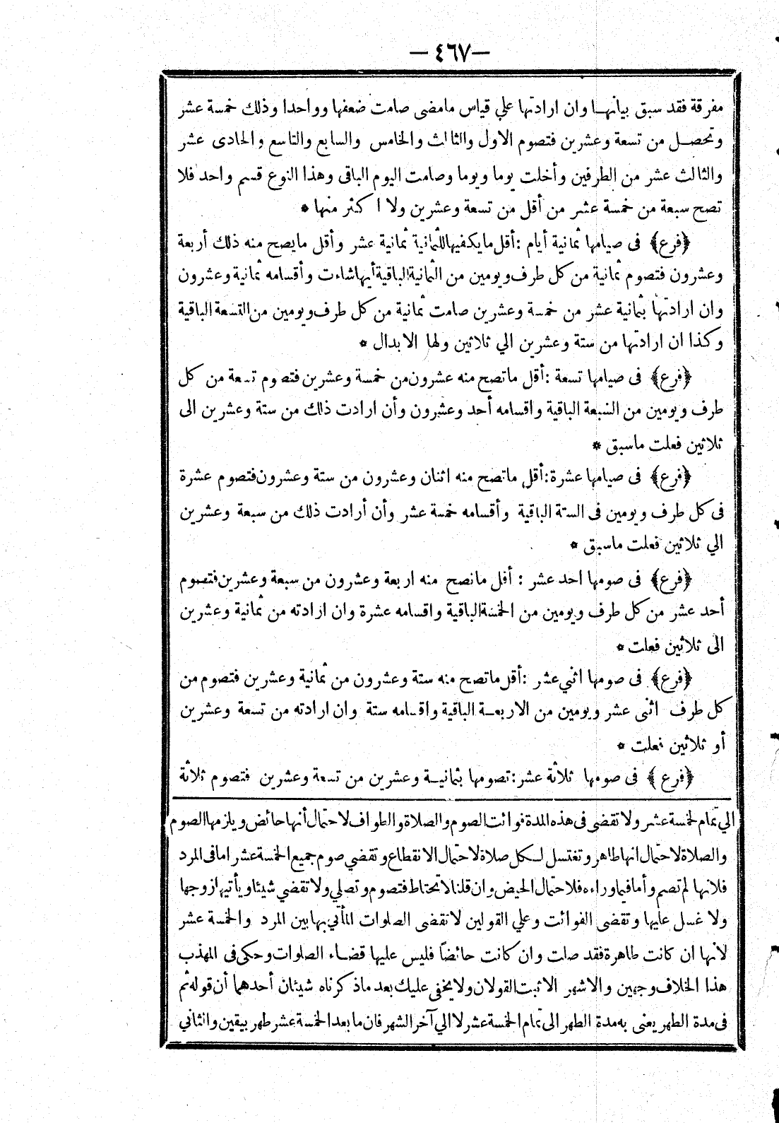 [الي تمام لخمسة عشر ولا تقضى في هذه المدة فوائت الصوم والصلاة والطواف لاحتمال أنها حائض ويلزمها الصوم والصلاة لاحتمال انها طاهر وتغتسل لكل صلاة لاحتمال الانقطاع وتقضي صوم جميع الخمسة عشر اما في المرد