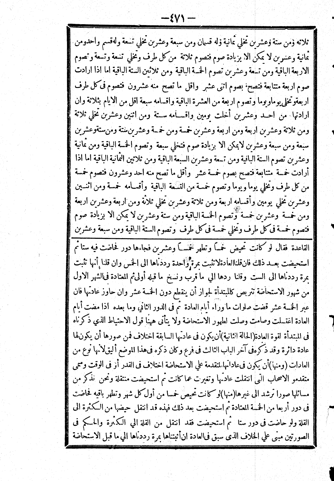 [القاعدة فقال لو كانت تحيض خمسا وتطهر خمسا وغشرين فجاءها دور فحاضت يه ستا ثم استحيضت بعد ذلك فان قلنا العادة لا تثبت بمرة واحدة رددناها إلى الخمس وان قلنا أنها تثبت بمرة رددناها إلى الست وقلنا ردها الي ما قرب ونسخ ما قبله أولى ثم المعتادة في الشهر الاول من شهور الاستحاضة تتربص كالمبتدأة لجواز أن ينقطع دون الخمسة عشر وان حاوز عادتها فان عبر الخمسة عشر قضت صلوات ما وراء أيام العادة ثم في الدور الثاني وما بعده إذا مضت أيام العادة اغتسلت وصامت وصلت لطهور الاستحاضة ولا يتأتى ههنا قول الاحتياط الذي ذكرناه في المبتدأة لقوة العادة (الحالة الثانية) أن يكون في عادتها السابقة اختلاف فمن صورها أن يكون لها عادة دائرة وقد ذكره في آخر الباب الثالث في فرع وكان ذكره في هذا الموضع أليق لانها نوع من العادات (ومنها) أن يكون في عاداتها المتقدمة علي الاستحاضة اختلاف في القدر أو في الوقت وسمى متقدمو الاصحاب التى انتقلت عادتها وتغيرت عما كانت ثم استحيضت منتقلة ونحن نذكر من مسائلها صورا ترشد إلى غيرها (منها) لو كانت تحيض خمسا من أول كل شهر وتطهر باقيه فحاضت في دور أربعا من الخمسة المعتادة ثم استحيضت بعد ذلك فهذه قد انتقل حيضها من الكثرة إلى