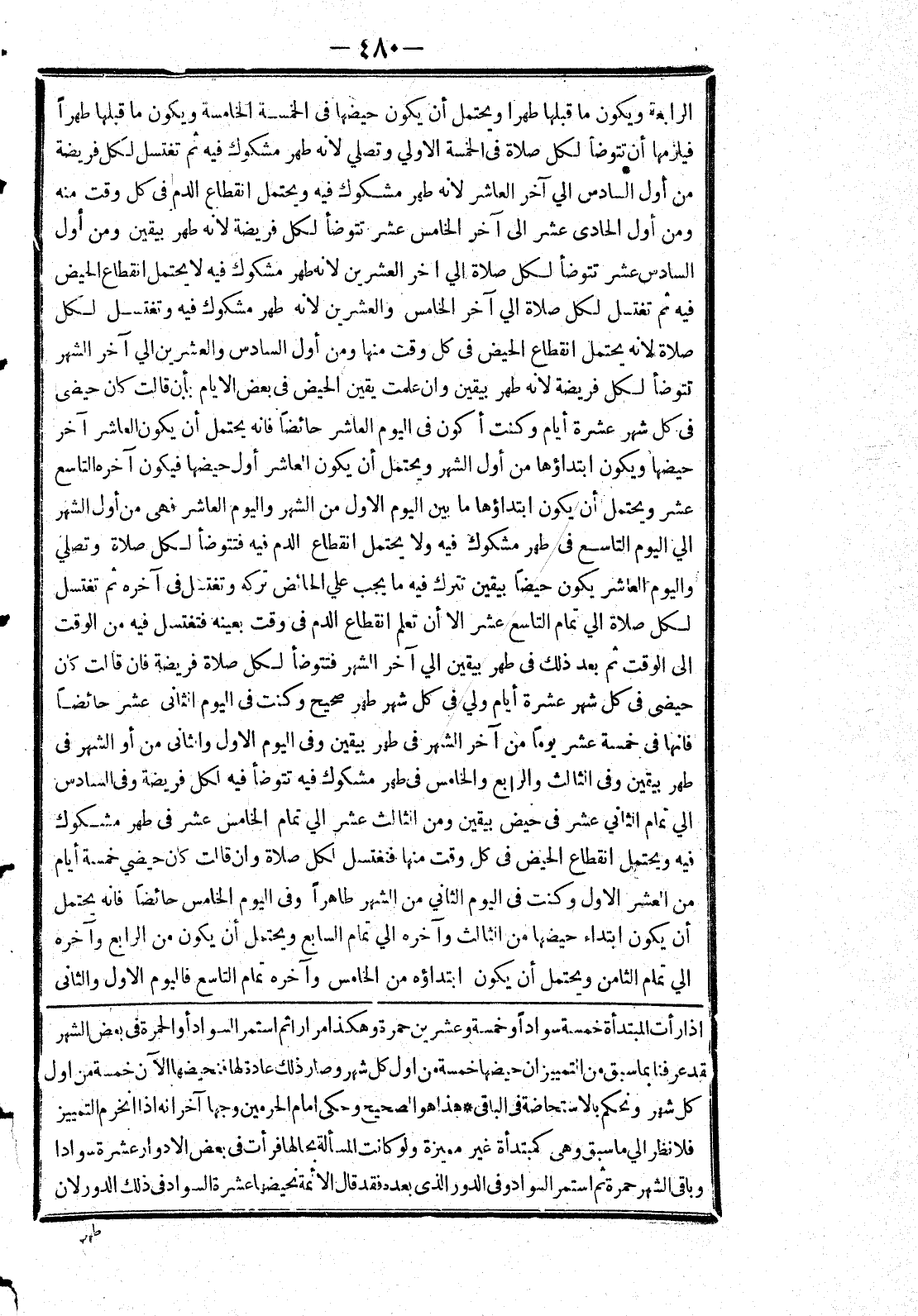 فلا نظر الي ما سبق وهى كمبتدأة غير مميزة ولو كانت المسألة بحالها فرأت في بعض الادوار عشرة سوادا وباقى الشهر حمرة ثم استمر السواد وفى الدور الذى بعده فقد قال الائمة نحيضها عشرة السواد في ذلك الدور لان]