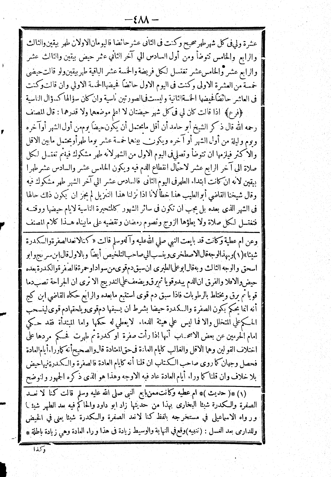 [وعن ام عطية وكانت قد بايعت النبي صلى الله عليه وسلم قالت (كنا لا نعد الصفرة والكدرة شيئا) وبهذا الوجه قال الاصطخرى وينسب الي صاحب التلخيص أيضا وبالاول قال ابن سريج وأبو اسحق والوجه الثالث وبه قال أبو على الطبري ان سبق دم قوى من سوادا وحمرة فالصفرة والكدرة بعده حيض والا فلا والفرق ان الدم يبدو قويا ثم يرق ويضعف علي التدريج الا ترى ان الجراحة تصب دما قويا ثم يرق ويختلط بالرطوبات فإذا سبق دم قوى استتبع ما بعده والرابع حكاه القاضي ابن كج أنه انما يحكم بكون الصفرة والكدرة حيضا بشرط ان يسبقها دم قوى ويلحقها دم قوى لينسحب الحكم علي المتخلل والا فما ليس علي هيئة الدماء لا يعطي له حكمها واما المبتدأة فقد حكي امام الحرمين عن بعض الاصحاب أنها إذا رأت صفرة أو كدرة ثم طهرت فحكم مردها على اختلاف القولين وهما الاقل والغالب كايام العادة في حق المعتادة قال والصحيح أنه كما وراء أيام العادة فحصل وجهان كما روى صاحب الكتاب ان قلنا أنه كايام العادة فالصفرة والكدرة فيها حيض بلا خلاف وان قلنا كما وراء أيام العادة عاد فيه الاوجه وهذا هو الذى ذكره الجمهور ولنوضح]
