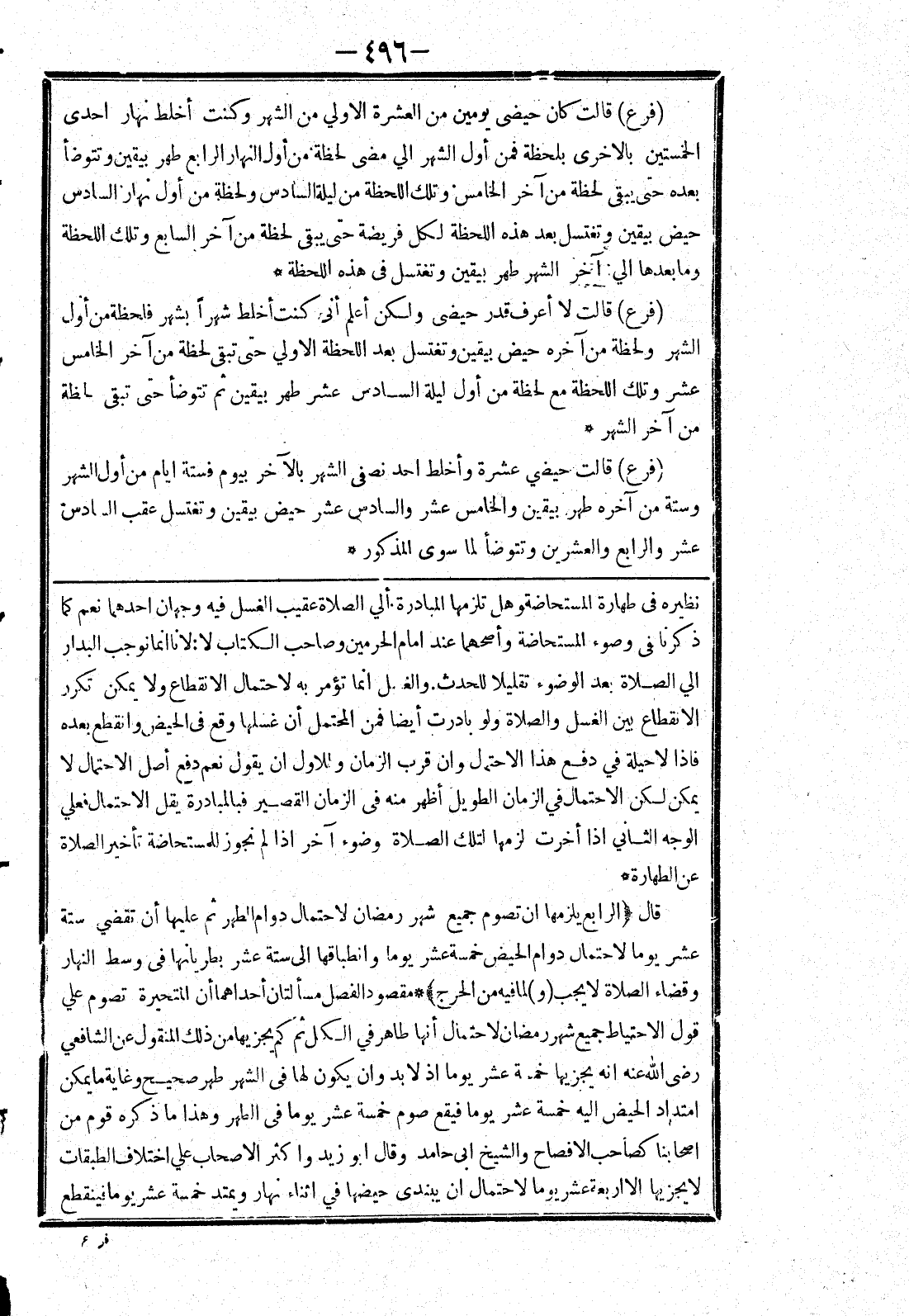 والغسل انما تؤمر به لاحتمال الانقطاع ولا يمكن تكرر الانقطاع بين الغسل والصلاة ولو بادرت أيضا فمن المحتمل أن غسلها وقع في الحيض وانقطع بعده فإذا لا حيلة في دفع هذا الاحتمال وان قرب الزمان وللاول ان يقول نعم دفع أصل الاحتمال لا يمكن لكن الاحتمال في الزمان الطويل أظهر منه في الزمان القصير فبالمبادرة يقل الاحتمال فعلي الوجه الثاني إذا أخرت لزمها لتلك الصلاة وضوء آخر إذا لم نجوز للمستحاضة تأخير الصلاة عن الطهارة * قال [الرابع يلزمها ان تصوم جميع شهر رمضان لاحتمال دوام الطهر ثم عليها أن تقضي ستة عشر يوما لاحتمال دوام الحيض خمسة عشر يوما وانطباقها إلى ستة عشر بطريانها في وسط النهار وقضاء الصلاة لا يجب (و) لما فيه من الحرج] * مقصود الفصل مسألتان أحداهما أن المتحيرة تصوم علي قول الاحتياط جميع شهر رمضان لاحتمال أنها طاهر في الكل ثم كم يجزيها من ذلك المنقول عن الشافعي رضى الله عنه انه يجزيها خمسة عشر يوما إذ لابد وان يكون لها في الشهر طهر صحيح وغاية ما يمكن امتداد الحيض إليه خمسة عشر يوما فيقع صوم خمسة عشر يوما في الطهر وهذا ما ذكره قوم من