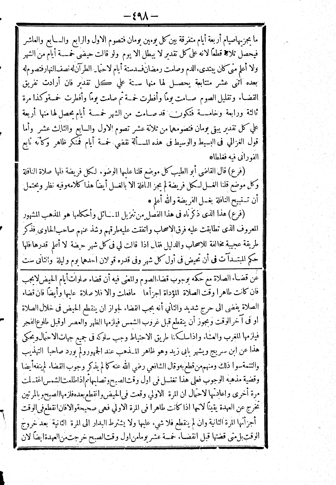 [عن قضاء الصلاة مع حكمه بوجوب قضاء الصوم والمعنى فيه أن قضاء صلوات أيام الحيض لا يجب فان كانت طاهرا وقت الصلاة المؤداة اجزأها ما فعلت والا فلا صلاة عليها وأيضا فان قضاء الصلاة يفضى إلى حرج شديد والثاني أنه يجب القضاء لجواز ان ينقطع الحيض في خلال الصلاة أو في آخر الوقت ويجوز أن ينقطع قبل غروب الشمس فيلزمها الظهر والعصر أو قبل طلوع الفجر