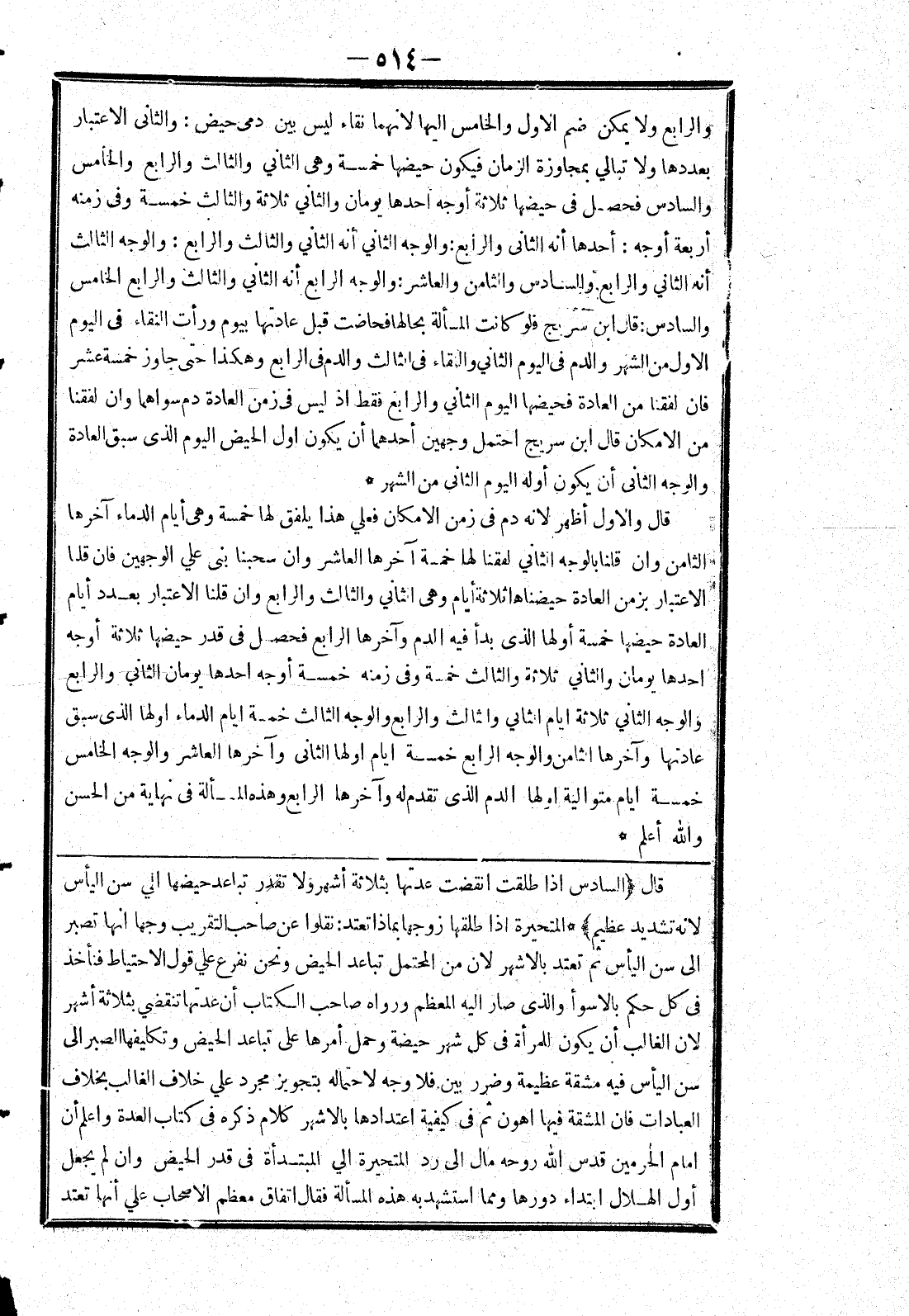 [قال [السادس إذا طلقت انقضت عدتها بثلاثة أشهر ولا تقدر تباعد حيضها الي سن اليأس لانه تشديد عظيم] * المتحيرة إذا طلقها زوجها بماذا تعتد: نقلوا عن صاحب التقريب وجها انها تصبر إلى سن اليأس ثم تعتد بالاشهر لان من المحتمل تباعد الحيض ونحن نفرع علي قول الاحتياط فنأخذ في كل حكم بالاسوأ والذى صار إليه المعظم ورواه صاحب الكتاب أن عدتها تنقضي بثلاثة أشهر لان الغالب أن يكون للمرأة في كل شهر حيضة وحمل أمرها على تباعد الحيض وتكليفها الصبر إلى سن اليأس فيه مشقة عظيمة وضرر بين فلا وجه لاحتماله بتجويز مجرد علي خلاف الغالب بخلاف العبادات فان المشقة فيها اهون ثم في كيفية اعتدادها بالاشهر كلام ذكره في كتاب العدة واعلم أن امام الحرمين قدس الله روحه مال إلى رد المتحيرة الي المبتدأة في قدر الحيض وان لم يجعل أول الهلال ابتداء دورها ومما استشهد به هذه المسألة فقال اتفاق معظم الاصحاب علي أنها تعتد]