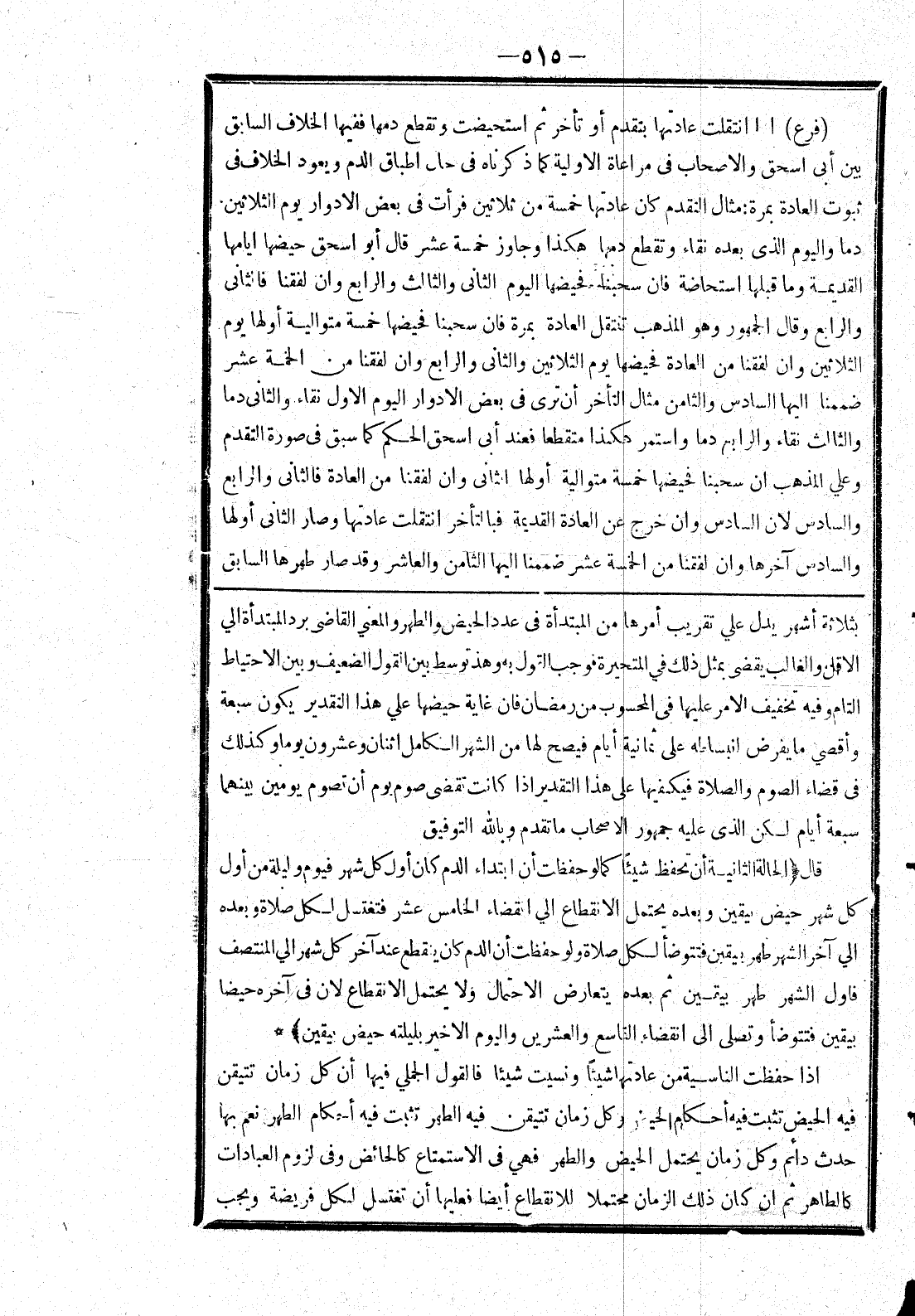 في قضاء الصوم والصلاة فيكفيها على هذا التقدير إذا كانت تقضى صوم يوم أن تصوم يومين بينهما سبعة أيام لكن الذى عليه جمهور الاصحاب ما تقدم وبالله التوفيق قال [الحالة الثانية أن تحفظ شيئا كما لو حفظت أن ابتداء الدم كان أول كل شهر فيوم وليلة من أول كل شهر حيض بيقين وبعده يحتمل الانقطاع الي انقضاء الخامس عشر فتغتسل لكل صلاة وبعده الي آخر الشهر طهر بيقين فتتوضأ لكل صلاة ولو حفظت أن الدم كان ينقطع عند آخر كل شهر الي المنتصف فاول الشهر طهر بيقين ثم بعده يتعارض الاحتمال ولا يحتمل الانقطاع لان في آخره حيضا بيقين فتتوضأ وتصلى إلى انقضاء التاسع والعشرين واليوم الاخير بليلته حيض بيقين] * إذا حفظت الناسية من عادتها شيئا ونسيت شيئا فالقول الجملي فيها أن كل زمان تتيقن فيه الحيض تثبت فيه أحكام الحيض وكل زمان تتيقن فيه الطهر تثبت فيه أحكام الطهر نعم بها حدث دائم وكل زمان يحتمل الحيض والطهر فهي في الاستمتاع كالحائض وفى لزوم العبادات كالطاهر ثم ان كان ذلك الزمان محتملا للانقطاع أيضا فعليها أن تغتسل لكل فريضة ويجب]