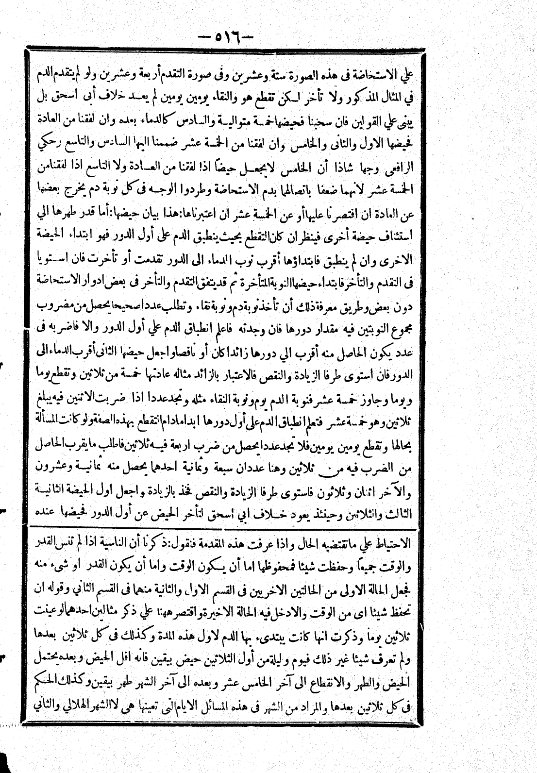 [الاحتياط علي ما تقتضيه الحال وإذا عرفت هذه المقدمة فنقول: ذكرنا أن الناسية إذا لم تنس القدر والوقت جميعا وحفظت شيئا فمحفوظها اما أن يكون الوقت واما أن يكون القدر أو شئ منه فجعل الحالة الاولى من الحالتين الاخريين في القسم الاول والثانية منهما في القسم الثاني وقوله ان تحفظ شيئا أي من الوقت والادخل فيه الحالة الاخيرة واقتصر ههنا علي ذكر مثالين احدهما لو عينت ثلاثين يوما وذكرت انها كانت يبتدئ بها الدم لاول هذه المدة وكذلك في كل ثلاثين بعدها ولم تعرف شيئا غير ذلك فيوم وليلة من أول الثلاثين حيض بيقين فانه اقل الحيض وبعده يحتمل الحيض والطهر والانقطاع إلى آخر الخامس عشر وبعده إلى آخر الشهر طهر بيقين وكذلك الحكم في كل ثلاثين بعدها والمراد من الشهر في هذه المسائل الايام التى تعينها هي لا الشهر الهلالي والثاني]