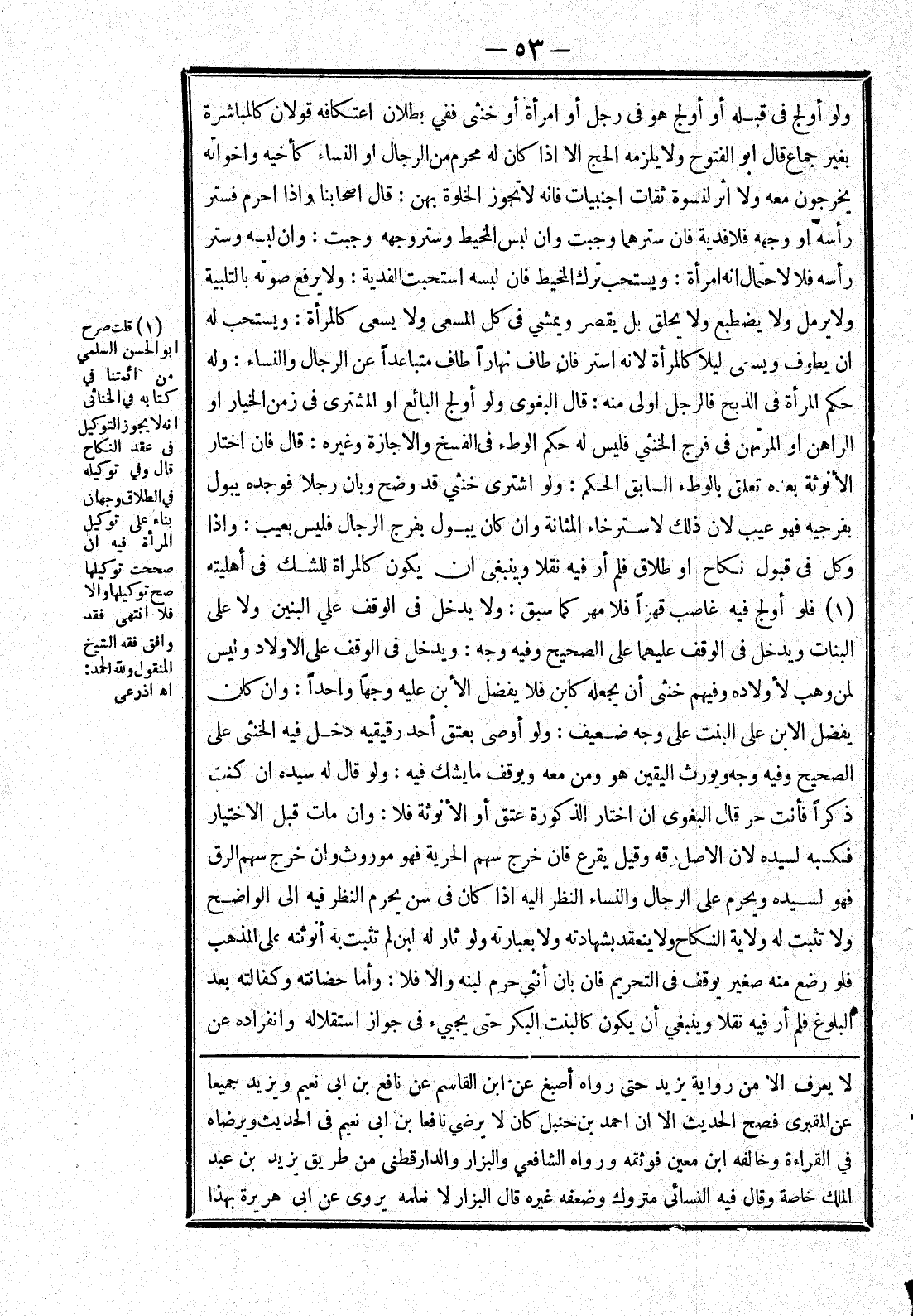 يُفَضِّلُ الِابْنَ عَلَى الْبِنْتِ عَلَى وَجْهٍ ضَعِيفٍ: وَلَوْ أَوْصَى بِعِتْقِ أَحَدِ رَقِيقَيْهِ دَخَلَ فِيهِ الْخُنْثَى عَلَى الصَّحِيحِ وَفِيهِ وَجْهٌ وَيُورَثُ الْيَقِينُ هُوَ وَمَنْ مَعَهُ وَيُوقَفُ مَا يُشَكُّ فِيهِ: وَلَوْ قَالَ لَهُ سَيِّدُهُ إنْ كُنْتَ ذَكَرًا فَأَنْتَ حُرٌّ قَالَ الْبَغَوِيّ إنْ اخْتَارَ الذُّكُورَةَ عتق أَوْ الْأُنُوثَةَ فَلَا: وَإِنْ مَاتَ قَبْلَ الِاخْتِيَارِ فَكَسْبُهُ لِسَيِّدِهِ لِأَنَّ الْأَصْلَ رِقُّهُ وَقِيلَ يُقْرَعُ فَإِنْ خَرَجَ سَهْمُ الْحُرِّيَّةِ فَهُوَ مَوْرُوثٌ وَإِنْ خَرَجَ سَهْمُ الرِّقِّ فَهُوَ لِسَيِّدِهِ وَيَحْرُمُ عَلَى الرِّجَالِ وَالنِّسَاءِ النَّظَرُ إلَيْهِ إذَا كَانَ فِي سِنٍّ يَحْرُمُ النَّظَرُ فِيهِ إلَى الْوَاضِحِ وَلَا تَثْبُتُ لَهُ وِلَايَةُ النِّكَاحِ وَلَا يَنْعَقِدُ بِشَهَادَتِهِ ولا بعبارته ولو ثَارَ لَهُ لَبَنٌ لَمْ تَثْبُتْ بِهِ أُنُوثَتُهُ عَلَى الْمَذْهَبِ فَلَوْ رَضَعَ مِنْهُ صَغِيرٌ يُوقَفُ فِي التَّحْرِيمِ فَإِنْ بَانَ أُنْثَى حُرِّمَ لَبَنُهُ والافلا: وَأَمَّا حَضَانَتُهُ وَكَفَالَتُهُ بَعْدَ الْبُلُوغِ فَلَمْ أَرَ فِيهِ نَقْلًا وَيَنْبَغِي أَنْ يَكُونَ كَالْبِنْتِ الْبِكْرِ حتى يجيئ في جواز استقلاله وانفراد عن