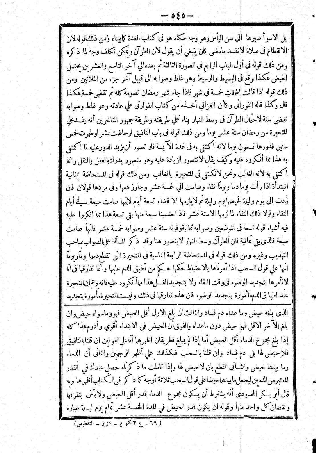 [الذى بلغه حيض وما عداه دم فساد والثالث ان بلغ الاول أقل الحيض فهو ما سواه حيض وان بلغ الآخر الاقل فهو حيض دون ما عداه والفرق أن الحيض في الابتداء أقوي وأدوم هذا كله إذا بلغ مجموع الدماء أقل الحيض أما إذا لم يبلغ فطريقان اظهرهما أنه علي القولين ان قلنا بالتلفيق فلا حيض لها بل دم فساد وان قلنا بالسحب فكذلك علي أظهر الوجهين والثانى أن الدماء وما بينها حيض والثانى القطع بان لا حيض لها وإذا تأملت ما ذكرناه حصل عندك في القدر المعتبر من الدمين ليجعل ما بينهما حيضا على قول السحب ثلاثة أوجه كما ذكر في الكتاب أظهرها وبه قال أبو بكر المحمودى أنه يشترط أن يكون مجموع الدماء قدر أقل الحيض ولا بأس بتفرقها ونقصان كل واحد منها وقوله ان يكون قدر الحيض في المدة الخمسة عشر تمام يوم ليلة عبارة]