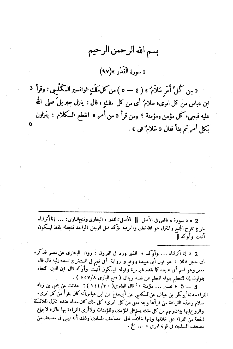 (2) . - 3- 5 «تفسير ... مؤمنة» : قال الطبري (30/ 144: حدثت عن يحيى بن زياد الفراء حدثنا أبو بكر بن عياش عن الكلبي عن أبى صالح عن ابن عباس أنه كان يقرأ من كل امرئ سلام وهذه القراءة من قرأها وجه معنى من كل امرئ كل ملك كان معناه عنده تنزل الملائكة والروح فيها بإذن ربهم من كل ملك يسلم على المؤمنين والمؤمنات ولا أرى القراءة بها جائزة لاجماع الحجة من القراء على خلافها وإنها خلاف لما فى مصاحف المسلمين وذلك أنه ليس فى مصحف من مصحف المسلمين فى قوله امرئ ... إلخ. [.....]
