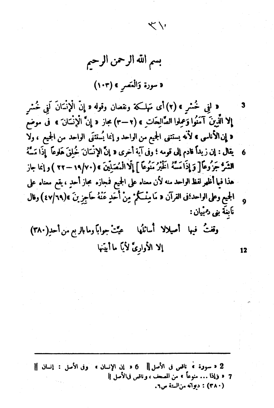 «لَفِي خُسْرٍ» (2) أي مهلكة ونقصان وقوله «إِنَّ الْإِنْسانَ لَفِي خُسْرٍ إِلَّا الَّذِينَ آمَنُوا وَعَمِلُوا الصَّالِحاتِ» (2- 3) مجاز «إِنَّ الْإِنْسانَ» فى موضع «إن الأناسى» لأنه يستثنى الجميع من الواحد وإنما يستثنى الواحد من الجميع، ولا يقال: إن زيدا قادم إلى قومه وفى آية أخرى «إِنَّ الْإِنْسانَ خُلِقَ هَلُوعاً إِذا مَسَّهُ الشَّرُّ جَزُوعاً [وَإِذا مَسَّهُ الْخَيْرُ مَنُوعاً] إِلَّا الْمُصَلِّينَ» (70/ 19- 22) وإنما جاز هذا فيما أظهر لفظ الواحد منه لأن معناه على الجميع فمجازه مجاز أحد، يقع معناه على الجميع وعلى الواحد فى القرآن «فَما مِنْكُمْ مِنْ أَحَدٍ عَنْهُ حاجِزِينَ» (69/ 47) وقال نابغة بنى دبيان: