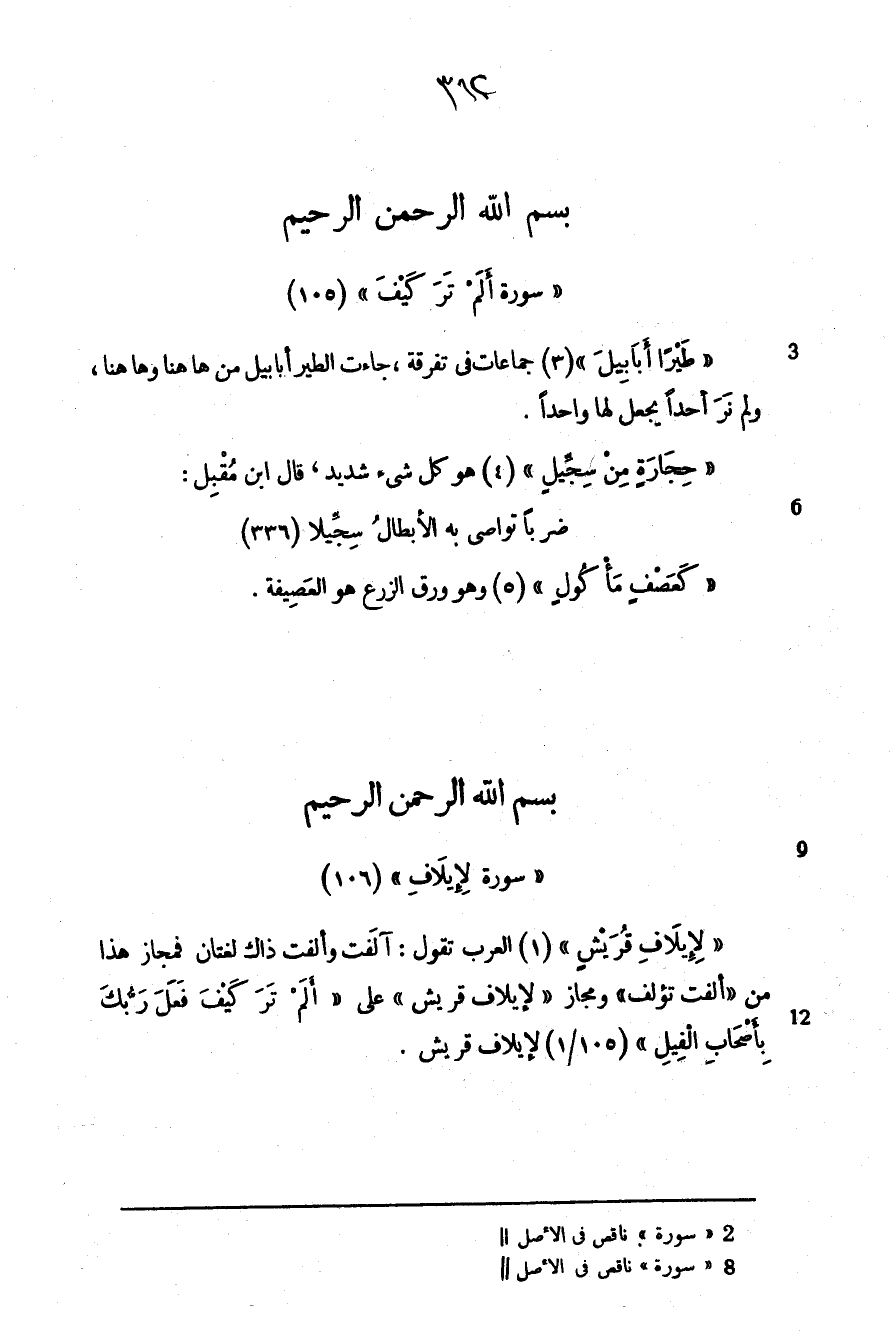 «لِإِيلافِ قُرَيْشٍ» (1) العرب تقول: آلفت وألفت ذاك لغتان فمجاز هذا من «ألفت تؤلف» ومجاز «لِإِيلافِ قُرَيْشٍ» على «أَلَمْ تَرَ كَيْفَ فَعَلَ رَبُّكَ بِأَصْحابِ الْفِيلِ» (105/ 1) لإيلاف قريش.