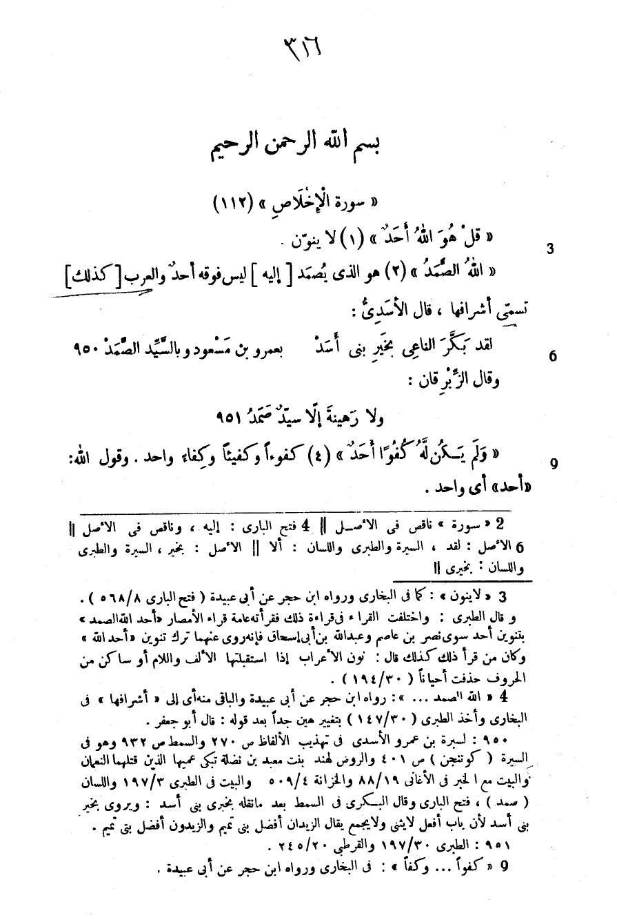 (2) . - 4 «الله الصمد ... » : رواه ابن حجر عن أبى عبيدة والباقي منه أي إلى «أشرافها» فى البخاري وأخذ الطبري (30/ 147) بتغيير هين جدا بعد قوله: قال أبو جعفر.