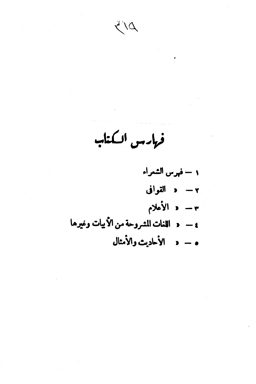1- فهرس الشعراء 2- «القوافي 3- «الأعلام 4- «اللغات المشروحة من الأبيات وغيرها 5- «الأحاديث والأمثال.
