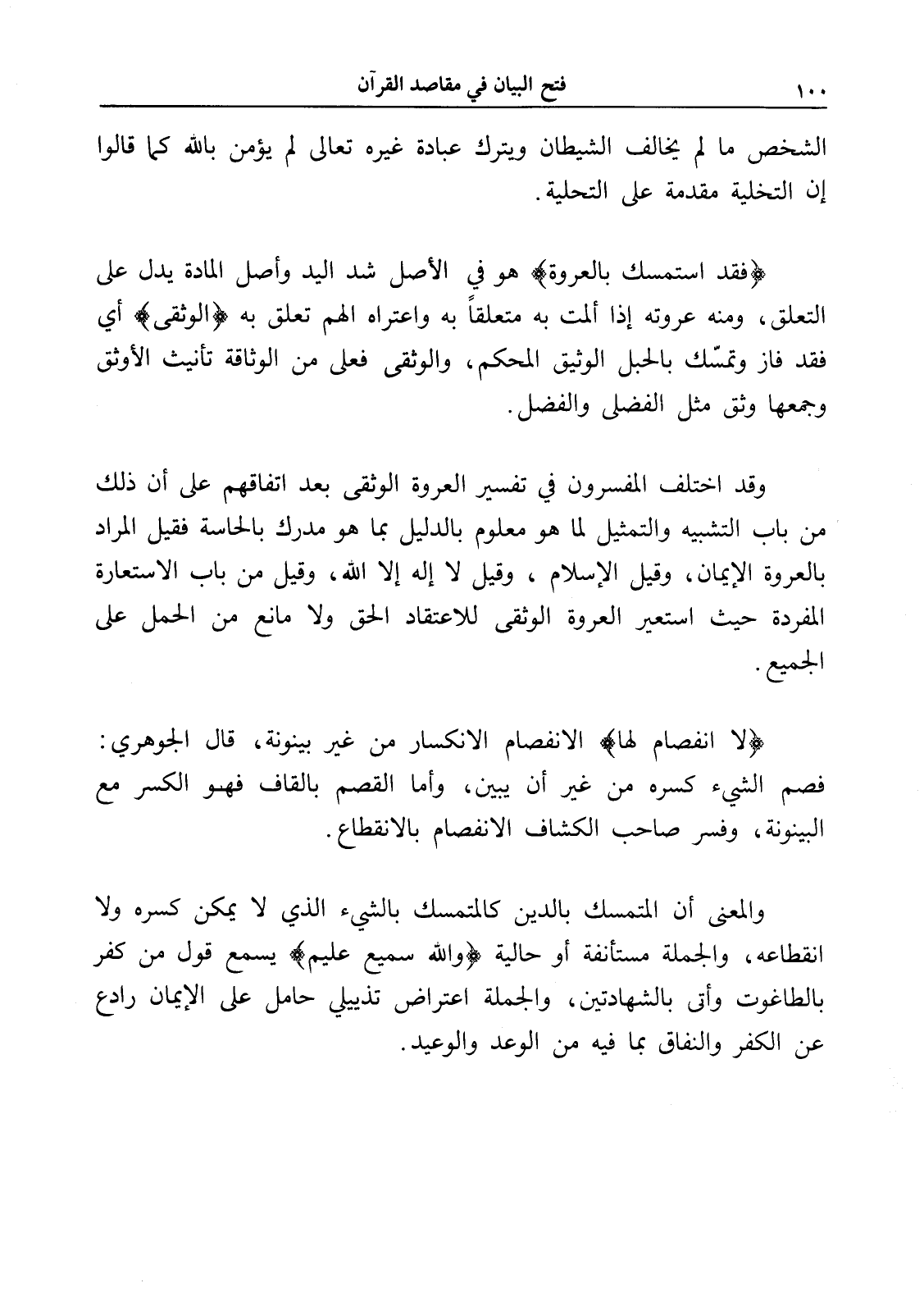 وقد اختلف المفسرون في تفسير العروة الوثقى بعد اتفاقهم على أن ذلك من باب التشبيه والتمثيل لما هو معلوم بالدليل بما هو مدرك بالحاسة فقيل المراد بالعروة الإيمان، وقيل الإسلام، وقيل لا إله إلا الله، وقيل من باب الاستعارة المفردة حيث استعير العروة الوثقى للاعتقاد الحق ولا مانع من الحمل على الجميع.