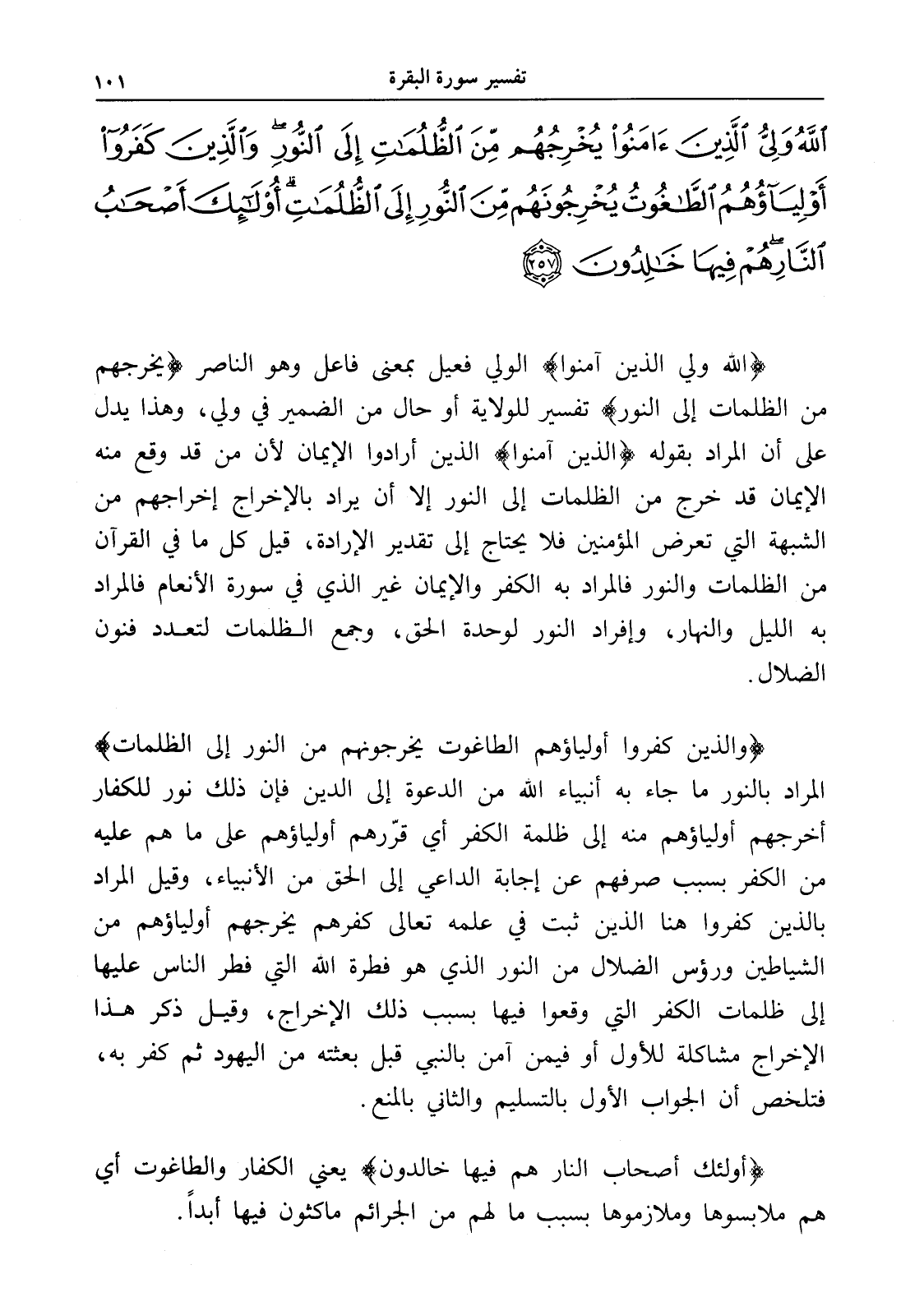 اللَّهُ وَلِيُّ الَّذِينَ آَمَنُوا يُخْرِجُهُمْ مِنَ الظُّلُمَاتِ إِلَى النُّورِ وَالَّذِينَ كَفَرُوا أَوْلِيَاؤُهُمُ الطَّاغُوتُ يُخْرِجُونَهُمْ مِنَ النُّورِ إِلَى الظُّلُمَاتِ أُولَئِكَ أَصْحَابُ النَّارِ هُمْ فِيهَا خَالِدُونَ (257)