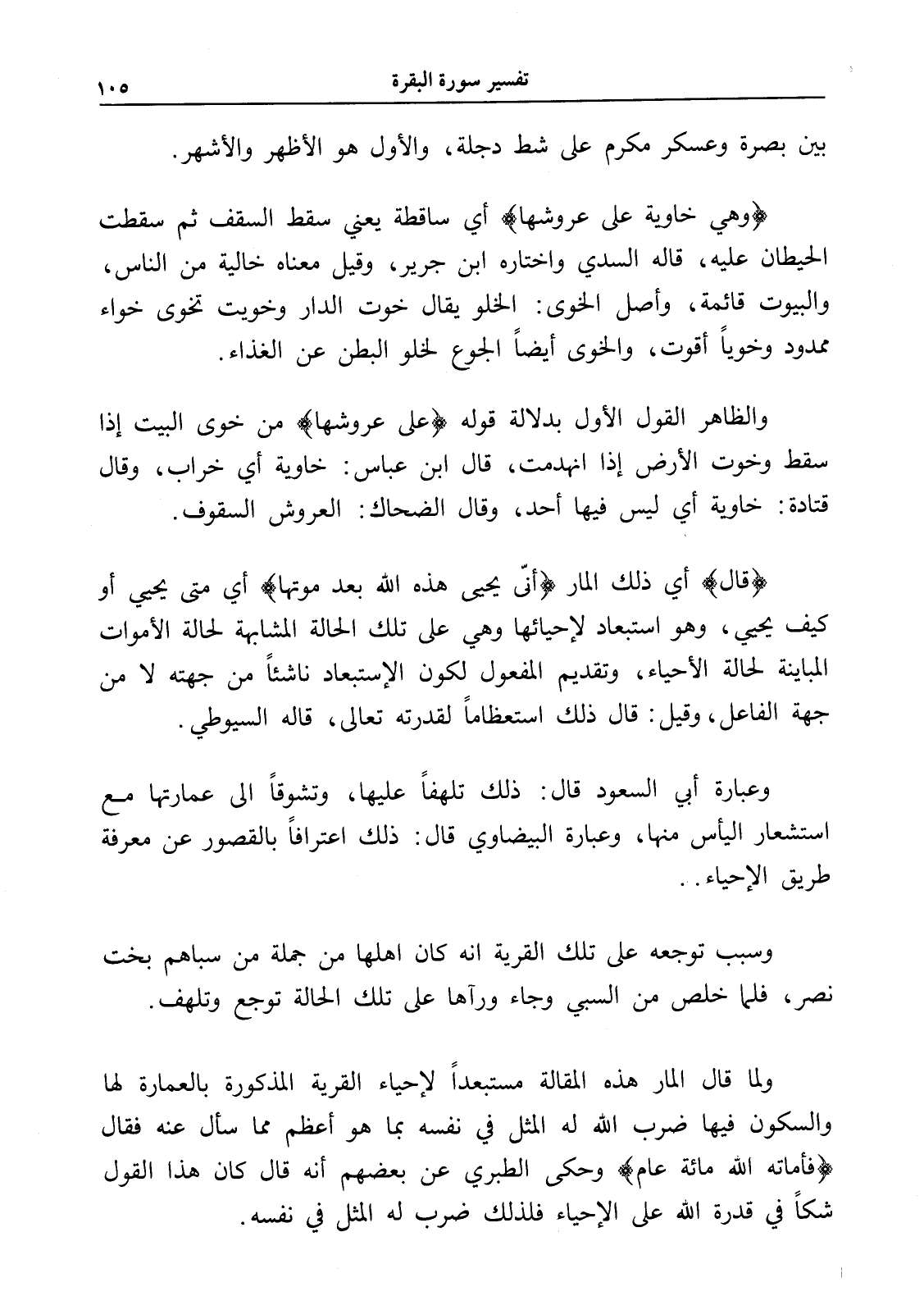 (وهي خاوية على عروشها) أي ساقطة يعني سقط السقف ثم سقطت الحيطان عليه، قاله السدي واختاره ابن جرير، وقيل معناه خالية من الناس، والبيوت قائمة، وأصل الخوى: الخلو يقال خوت الدار وخويت تخوى خواء ممدود وخوياً أقوت، والخوى أيضاً الجوع لخلو البطن عن الغذاء.