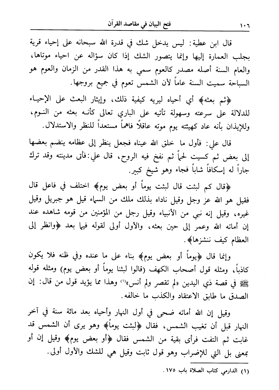قال ابن عطية: ليس يدخل شك في قدرة الله سبحانه على إحياء قرية بجلب العمارة إليها وإنما يتصور الشك إذا كان سؤاله عن إحياء موتاها، والعام السنة أصله مصدر كالعوم سمي به هذا القدر من الزمان والعوم هو السباحة سميت السنة عاماً لأن الشمس تعوم في جميع بروجها.