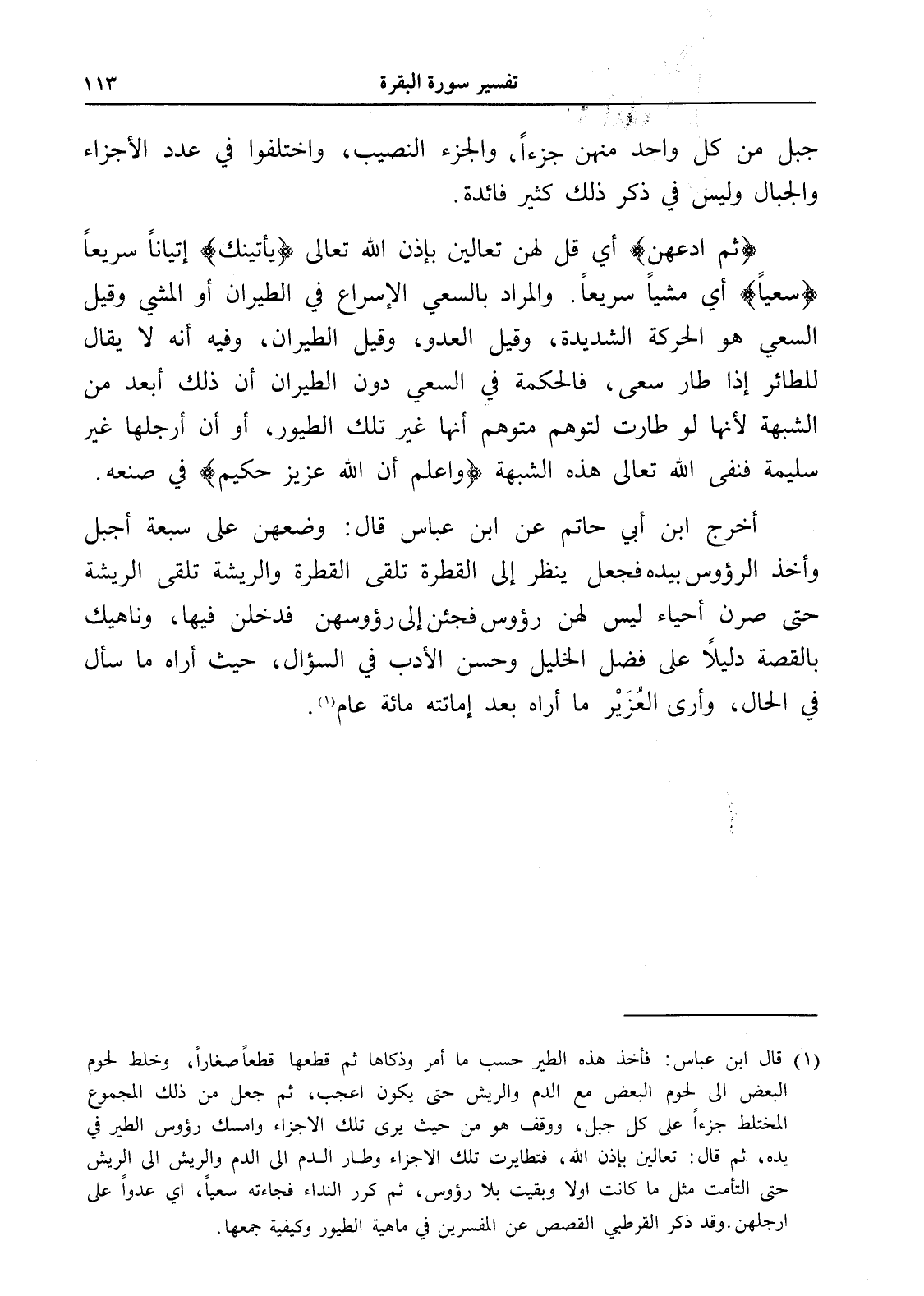 (¬1) قال ابن عباس: فأخذ هذه الطير حسب ما أمر وذكاها ثم قطعها قطعاً صغاراً، وخلط لحوم البعض إلى لحوم البعض مع الدم والريش حتى يكون أعجب، ثم جعل من ذلك المجموع المختلط جزءاً على كل جبل، ووقف هو من حيث يرى تلك الأجزاء وامسك رؤوس الطير في يده، ثم قال: تعالين بإذن الله، فتطايرت تلك الأجزاء وطار الدم إلى الدم والريش إلى الريش حتى التأمت مثل ما كانت أولاً وبقيت بلا رؤوس، ثم كرر النداء فجاءته سعياً، أي عدواً على أرجلهن. وقد ذكر القرطبي القصص عن المفسرين في ماهية الطيور وكيفية جمعها.