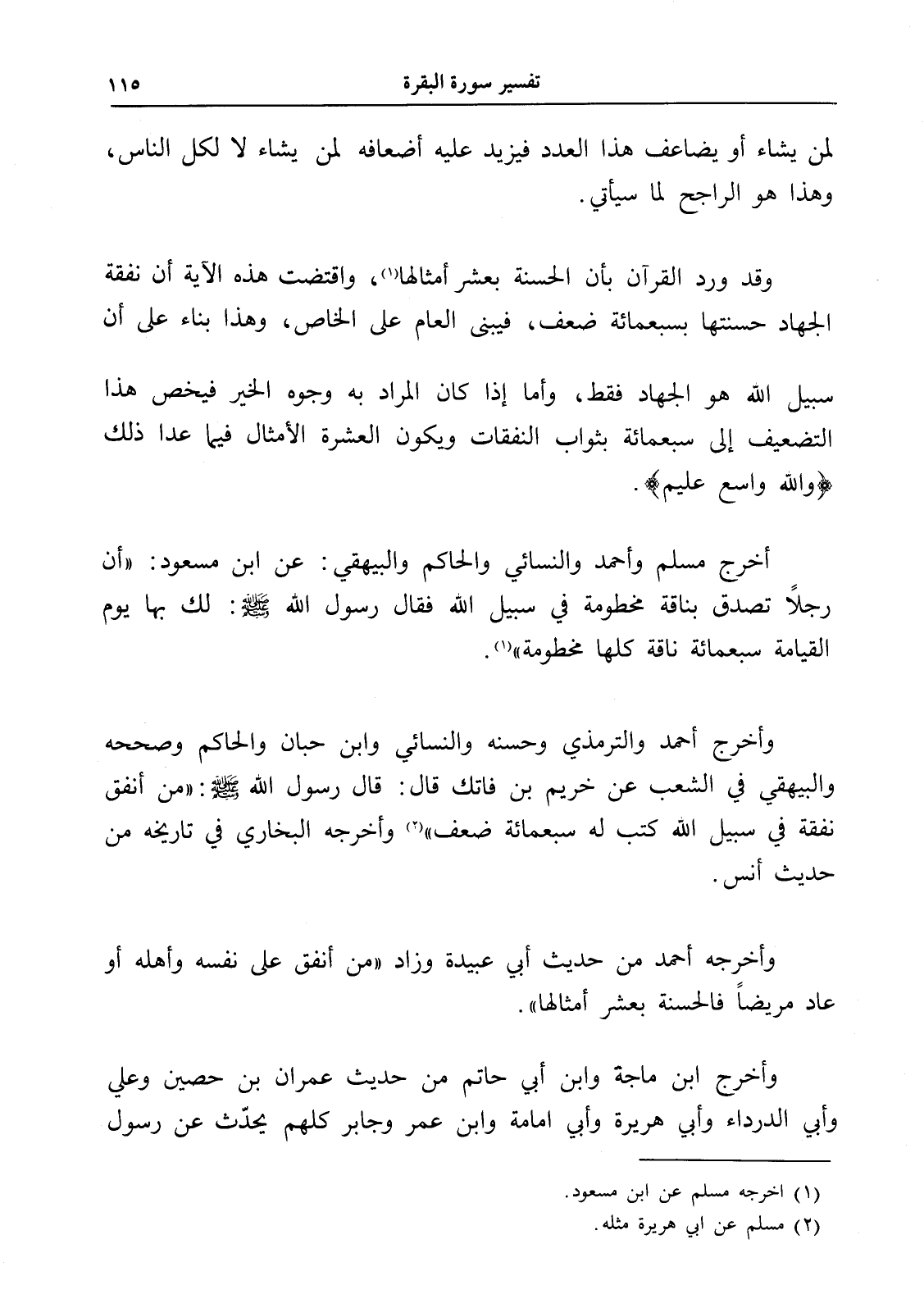 أخرج مسلم وأحمد والنسائي والحاكم والبيهقي: عن ابن مسعود: " أن رجلاً تصدق بناقة مخطومة في سبيل الله فقال رسول الله - صلى الله عليه وسلم -: لك بها يوم القيامة سبعمائة ناقة كلها مخطومة " (1).
