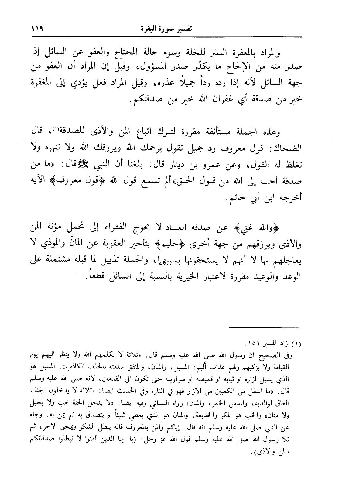 وفي الصحيح أن رسول الله صلى الله عليه وسلم قال: " ثلاثة لا يكلمهم الله ولا ينظر إليهم يوم القيامة ولا يزكيهم ولهم عذاب أليم: المسبل، والمنان، والمنفق سلعته بالحلف الكاذب ". المسبل هو الذي يسبل إزاره أو ثيابه أو قميصه أو سراويله حتى تكون إلى القدمين، لأنه صلى الله عليه وسلم قال. " ما أسفل من الكعبين من الإزار فهو في النار " وفي الحديث أيضاً: " ثلاثة لا يدخلون الجنة، العاق لوالديه، والمدمن الخمر، والمنان " رواه النسائي وفيه أيضاً: " لا يدخل الجنة خب ولا بخيل ولا منان " والخب هو المكر والخديعة، والمنان هو الذي يعطي شيئاً أو يتصدق به ثم يمن به. وجاء عن النبي صلى الله عليه وسلم أنه قال: إياكم والمن بالمعروف فإنه يبطل الشكر ويمحق الأجر، ثم تلا رسول الله صلى الله عليه وسلم قول الله عز وجل: (يا أيها الذين آمنوا لا تبطلوا صدقاتكم بالمن والأذى).