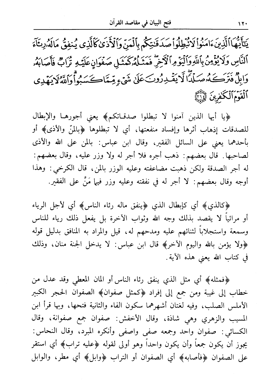 يَا أَيُّهَا الَّذِينَ آَمَنُوا لَا تُبْطِلُوا صَدَقَاتِكُمْ بِالْمَنِّ وَالْأَذَى كَالَّذِي يُنْفِقُ مَالَهُ رِئَاءَ النَّاسِ وَلَا يُؤْمِنُ بِاللَّهِ وَالْيَوْمِ الْآَخِرِ فَمَثَلُهُ كَمَثَلِ صَفْوَانٍ عَلَيْهِ تُرَابٌ فَأَصَابَهُ وَابِلٌ فَتَرَكَهُ صَلْدًا لَا يَقْدِرُونَ عَلَى شَيْءٍ مِمَّا كَسَبُوا وَاللَّهُ لَا يَهْدِي الْقَوْمَ الْكَافِرِينَ (264)