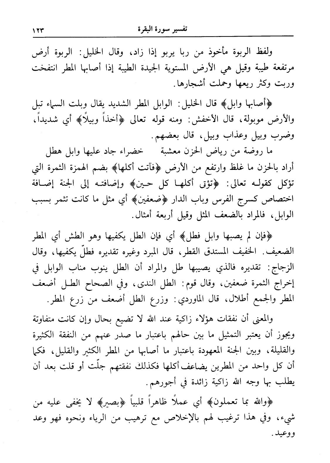 والمعنى أن نفقات هؤلاء زاكية عند الله لا تضيع بحال وإن كانت متفاوتة ويجوز أن يعتبر التمثيل ما بين حالهم باعتبار ما صدر عنهم من النفقة الكثيرة والقليلة، وبين الجنة المعهودة باعتبار ما أصابها من المطر الكثير والقليل، فكما أن كل واحد من المطرين يضاعف أكلها فكذلك نفقتهم جلّت أو قلت بعد أن يطلب بها وجه الله زاكية زائدة في أجورهم.