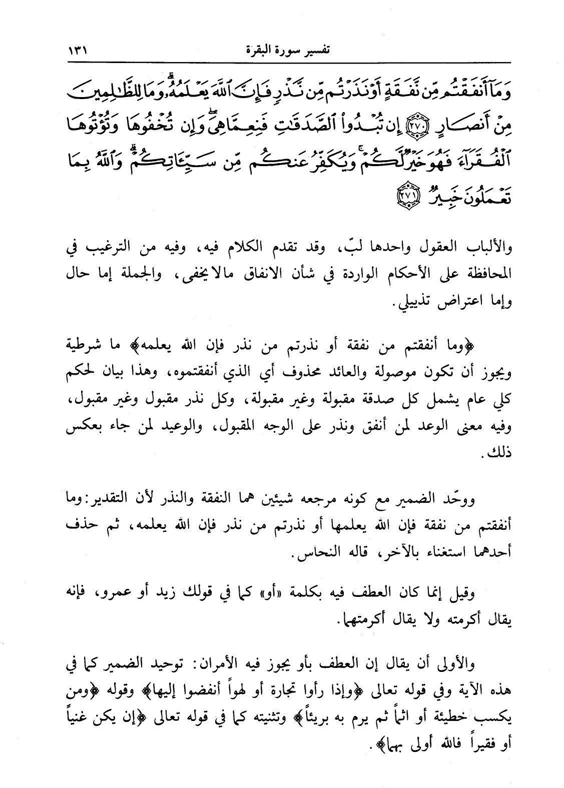 وَمَا أَنْفَقْتُمْ مِنْ نَفَقَةٍ أَوْ نَذَرْتُمْ مِنْ نَذْرٍ فَإِنَّ اللَّهَ يَعْلَمُهُ وَمَا لِلظَّالِمِينَ مِنْ أَنْصَارٍ (270) إِنْ تُبْدُوا الصَّدَقَاتِ فَنِعِمَّا هِيَ وَإِنْ تُخْفُوهَا وَتُؤْتُوهَا الْفُقَرَاءَ فَهُوَ خَيْرٌ لَكُمْ وَيُكَفِّرُ عَنْكُمْ مِنْ سَيِّئَاتِكُمْ وَاللَّهُ بِمَا تَعْمَلُونَ خَبِيرٌ (271)