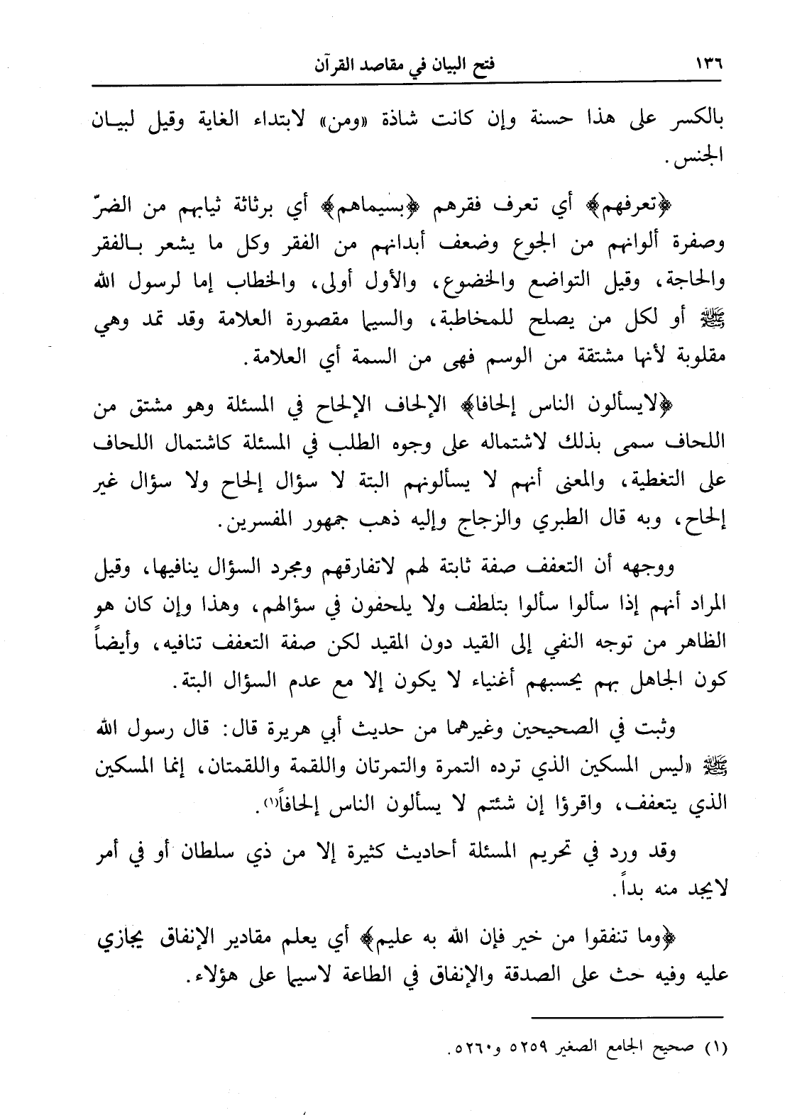 وثبت في الصحيحين وغيرهما من حديث أبي هريرة قال: قال رسول الله - صلى الله عليه وسلم - " ليس المسكين الذي ترده التمرة والتمرتان واللقمة واللقمتان، إنما المسكين الذي يتعفف، واقرؤا إن شئتم لا يسألون الناس إلحافاً (¬1) ".